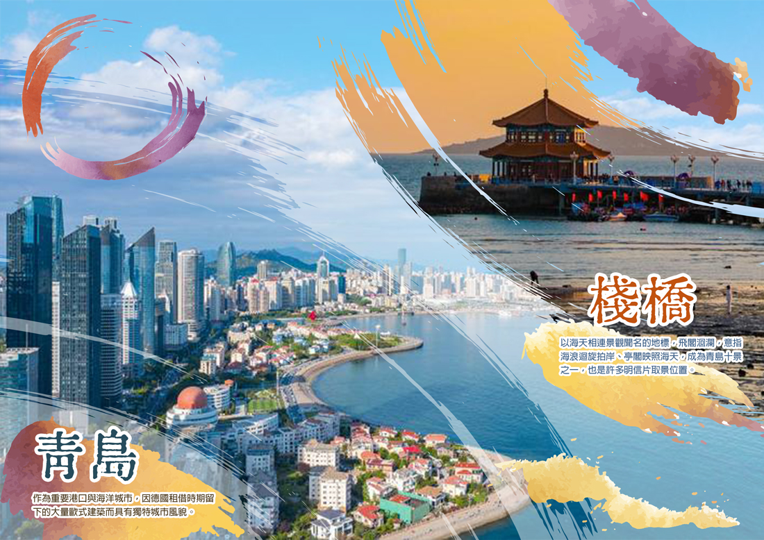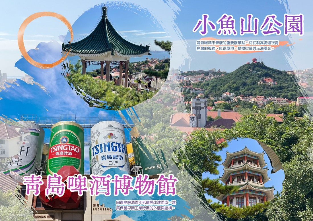 【青島】位於山東半島南部,是沿海港口城市,也因德國租借時期留下的大量歐式建築而具有獨特城市風貌。城市依山臨海,海岸線綿長,紅瓦、綠樹、碧海的景色構成青島極具辨識度的城市印象。作為重要港口與海洋城市,青島的啤酒產業、海鮮文化與濱海景觀非常有名,是旅遊、文化與海洋產業並存的代表城市。青島的城市區域由山巒串接,如信號山、小魚山等制高點,能俯瞰海岸、老城街區與歐風建築群。棧橋是城市象徵之一,八大關以各國風格建築聞名,大學路與周邊街區則保留濃厚歷史韻味。青島啤酒博物館更是旅客必訪,記錄百年啤酒文化與工業發展。整體城市融合濱海景觀、歷史文化與多元建築,呈現出輕鬆又充滿特色的旅遊面貌。