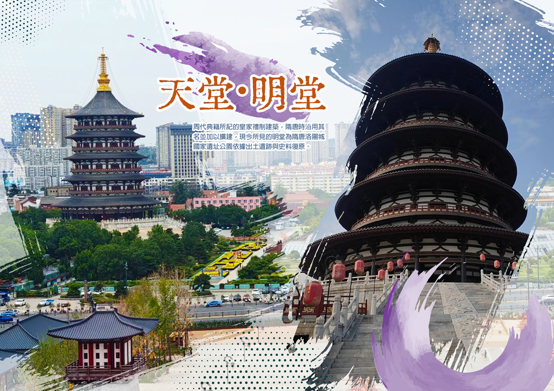探訪隋唐時期政治與宗教的重要代表建築【天堂.明堂】位於隋唐洛陽城國家遺址公園內,是了解武則天時期政治與宗教制度的重要建築群。明堂原為周代典籍所記的皇家禮制建築,象徵天命與王權,隋唐時沿用其名並加以擴建。武則天在洛陽稱帝後,以此為朝政中心,文獻記載她在明堂舉行祭天、受朝儀典,透過建築形制展現政權正統性。現今所見的明堂依據出土遺跡與史料復原,以圓形重檐的建築呈現唐代宮殿格局。天堂則為唐代佛教禮儀空間,為當時祈福與供奉的重要場所。今日的高塔建築採仿唐風格重建,內部展示佛教文化與洛陽城的發展脈絡。整個景區融合考古成果與歷史復原,使旅客能更直觀理解盛唐皇城的規模與政治宗教生活的中心位置。