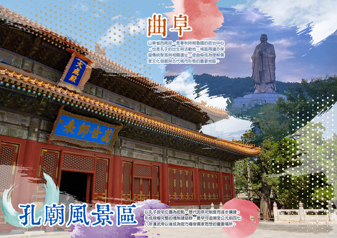 【曲阜】在山東省西南部,是春秋時期魯國的政治中心,也是孔子的出生與活動地。孔子在此講學、整理典籍並建立早期儒家思想,使曲阜逐漸形成以禮制與教育為核心的文化格局。自漢代起,歷代王朝在此設立官辦祭祀場所,孔廟、孔府與孔林的規模逐步擴大,街巷與城區軸線也因儒家禮制而建立明確的空間秩序,城市景觀至今仍保持部分古代制度留下的結構。曲阜的文化發展與家族制度密切相關,孔氏族人世代在此居住,形成延續性的宗族空間。三孔建築群記錄不同時期的增修痕跡,從院落布局到碑刻與建材皆呈現明清以來的變化。城區周邊亦保留傳統聚落與相關遺址,使曲阜成為理解儒家文化發展與古代城市形態的重要地區。