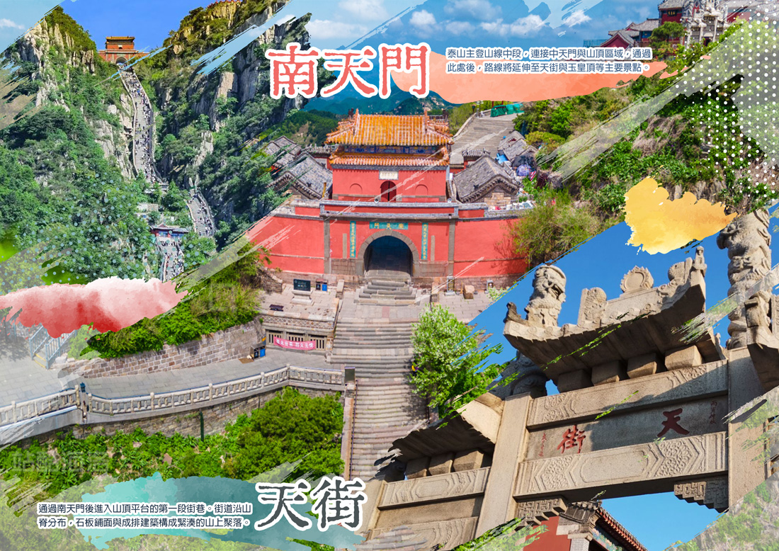 【南天門】是泰山主登山線中段,連接中天門與山頂區域,通過此處後,路線將延伸至天街與玉皇頂等主要景點。建築為石砌牌樓形式,置於山脊開口處,呈現山頂入口的空間特徵。從中天門往上需經過十八盤,階梯密集、坡度明顯,是整段登山路線中最具代表性的陡坡。抵達南天門後,可從高處清楚看到十八盤的地形起伏與石階排列,山勢從此轉為較為平緩的頂部平台。南天門周邊常有雲霧流動,與山勢形成鮮明的視覺界線,使此處成為進入泰山主峰區域前的明確分段點。