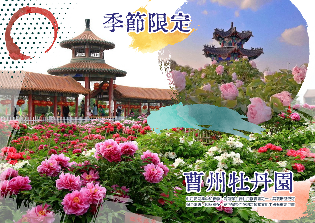 4月10日-04月30日:【曹州牡丹園】為菏澤主要牡丹觀賞區,其栽培歷史可追至隋唐,因品種多、花色層次完整而在地方植物文化中占有重要位置。園區面積廣,種植分區依花期、色系與品種排列,常見紅、粉、白、紫等多類牡丹,並保留部分傳統育種資源。牡丹花期集中於春季,園內多以地勢與步道串接觀賞路線,使旅客能依動線欣賞不同品種的開花狀態。 園區同時展示牡丹相關的歷史資料,包括古籍記載、地方培植方法與器具,呈現牡丹在菏澤長期栽培中的技術脈絡。部分區域規畫為盆栽展示與育苗區,園內景觀可看到不同生長階段的植株形態,以庭院式分區延伸至各觀賞帶。