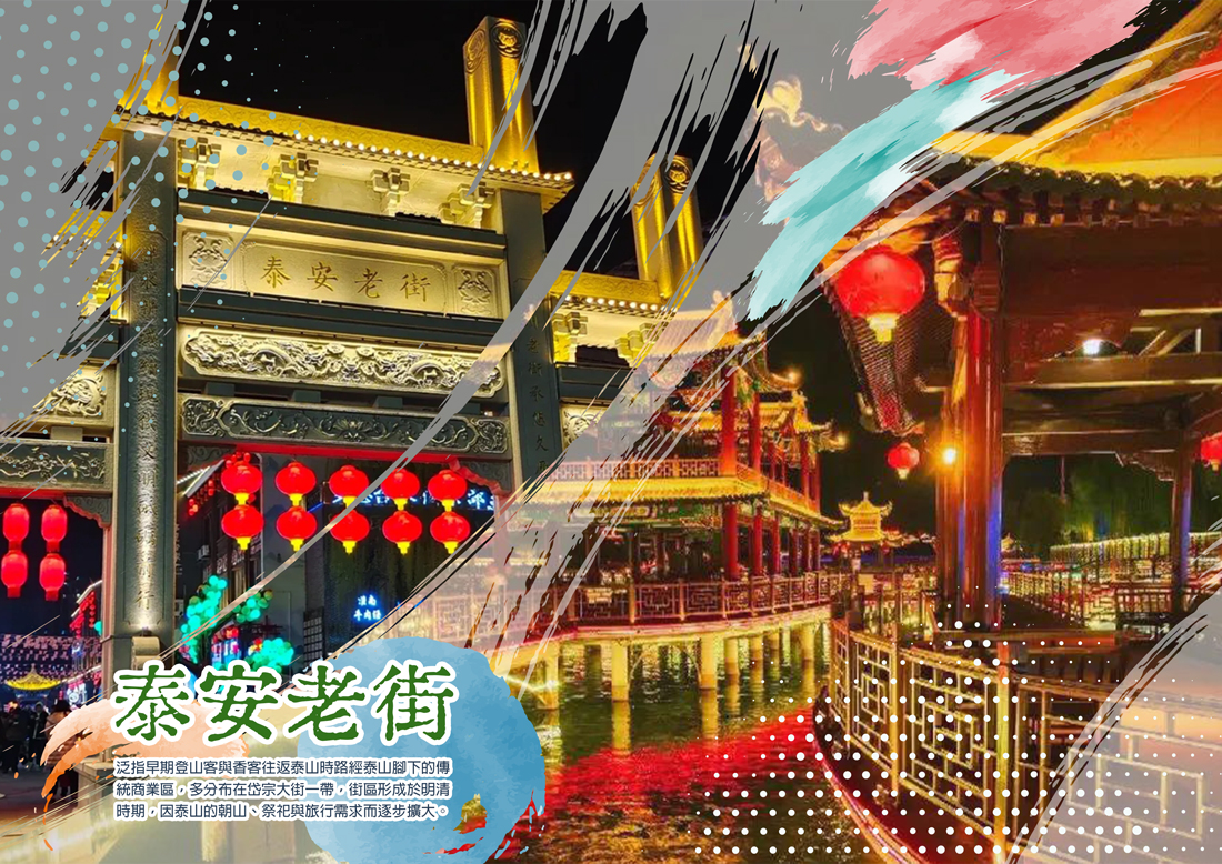 【泰安老街】泛指早期登山客與香客往返泰山時路經泰山腳下的傳統商業區,多分布在岱宗大街一帶,街區形成於明清時期,因泰山的朝山、祭祀與旅行需求而逐步擴大,商鋪以住宿、餐飲、小件用品與地方工藝為主,構成當地早期的生活與商業格局。隨著近代城市擴張,周邊店面樣貌有所更新,但街巷仍保留部分早期建築比例與傳統店舖立面,從木門、招牌到連續騎樓都能看到延續下來的元素。老街現況以小吃、土產與手作店舖為主,動線以步行為核心,街區密度高,巷道彼此連接,形成範圍穩定的街巷組成。前往泰山的主要道路從此處穿過,使老街與登山路線自然接合,街區的商業型態也因這一功能保持至今。