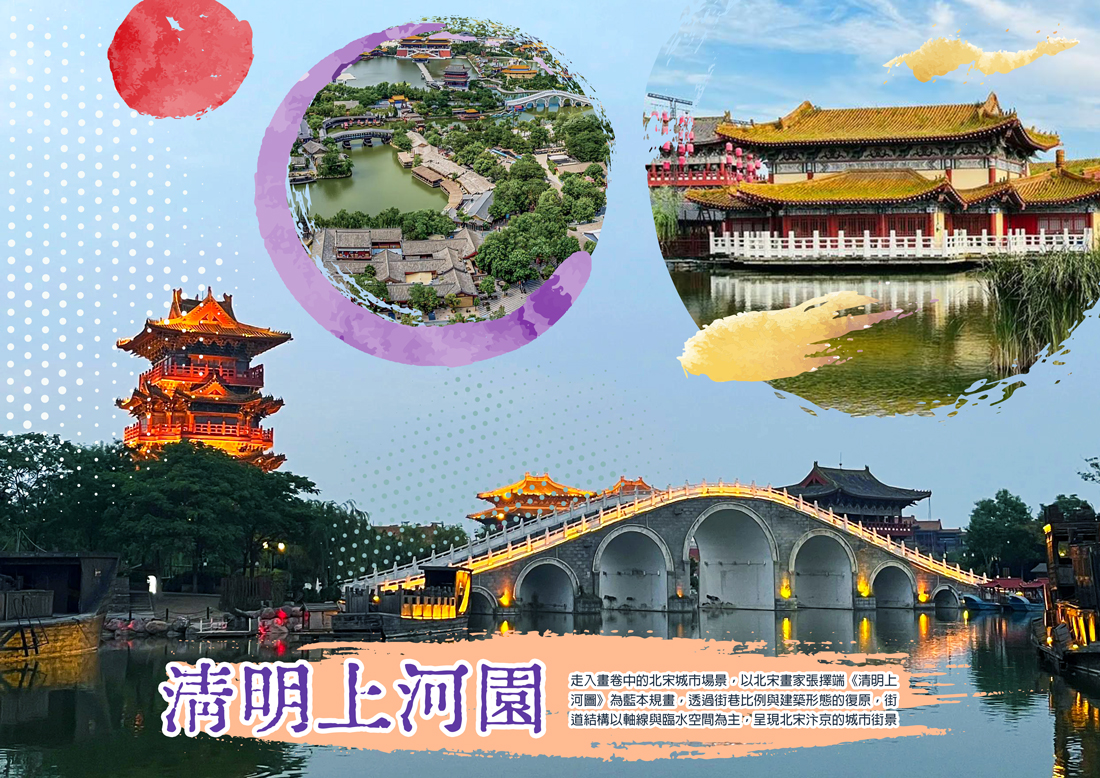 走入畫卷中的北宋城市場景【清明上河園】以北宋畫家張擇端《清明上河圖》為藍本規畫,透過街巷比例與建築形態的復原,呈現北宋汴京的城市空間。景區依畫作內容打造虹橋、汴河水岸、市井商鋪與作坊等場景,街道結構以軸線與臨水空間為主,使遊客能依動線看到不同類型的城市活動。園內的商坊與展示區涵蓋織染、木作、香料與飲食等多項工藝,反映宋代手工業與商業組織的運作方式。景區亦安排多個表演片段,以儀仗、街景互動與科舉展示等形式呈現畫作中記錄的生活面貌。建築群採仿宋式屋瓦與木構,結合水道與橋樑,使整體景觀與原畫描繪的氛圍相接。清明上河園以實體空間重新構成畫作中的城市片段,讓北宋汴京的街巷形態與生活細節得以透過步行動線一一呈現。