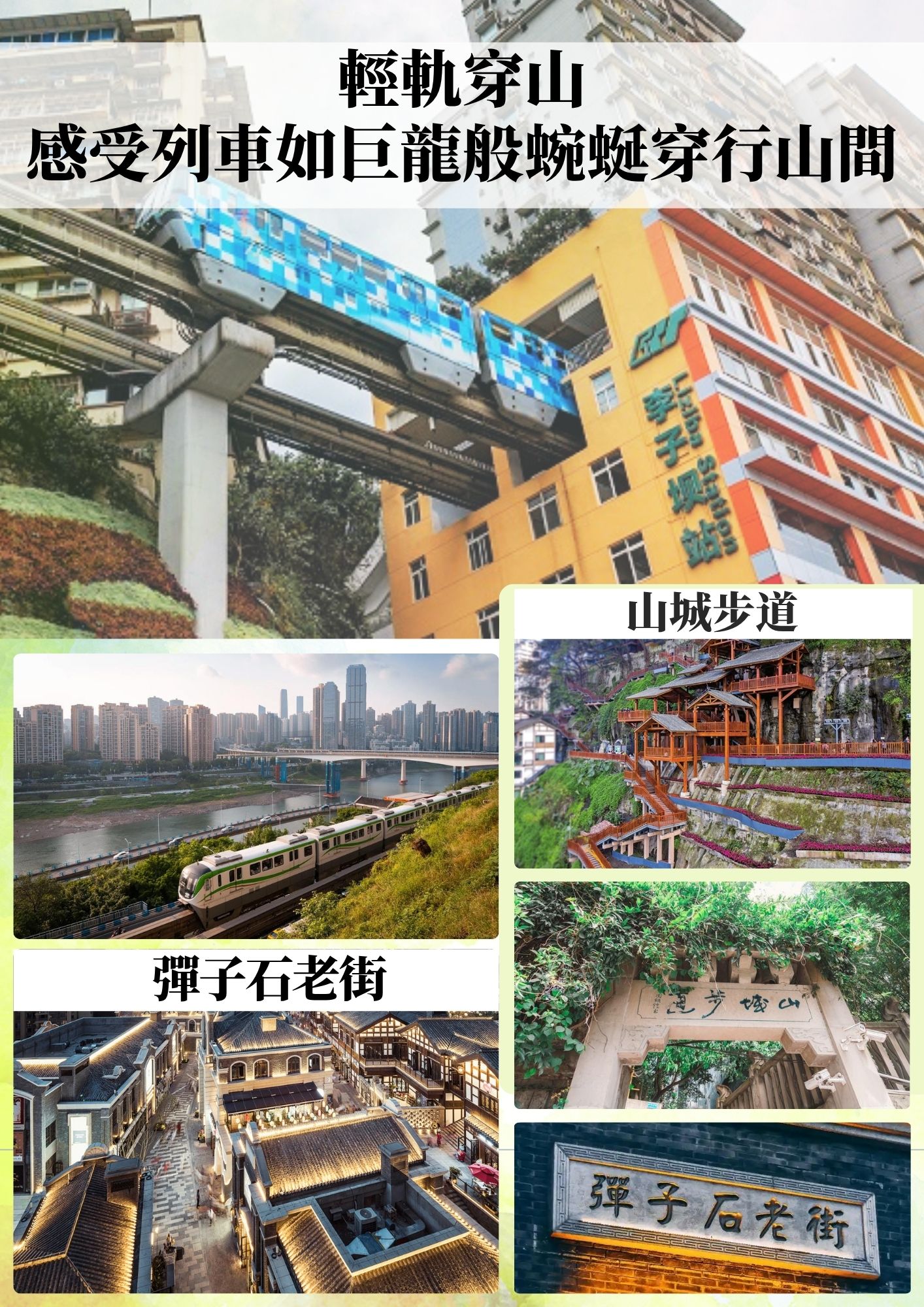 感受列車如巨龍般蜿蜒穿行山間【輕軌穿山平臺】是重慶山城交通的獨特景觀,也是一個結合城市建設與自然地形的工程奇蹟。整個平臺建於山體之上,輕軌列車沿著蜿蜒的軌道穿過山坡和平臺,山城的立體地貌因此更加生動可見。站在平臺上,既能近距離觀察列車穿行山間的壯觀景象,也能俯瞰腳下的街巷與坡地建築,城市的層次感一覽無遺。平臺周邊設有觀景區與步道,遊人可以停下來欣賞列車通過的畫面,或拍攝江水、樓宇與軌道交織的城市景致。列車通過平臺的瞬間帶來節奏感與動態美,與山城的坡地街巷形成鮮明對比,也展現出重慶在地理條件下的建設智慧。無論是乘坐輕軌還是在平臺上觀景,都能直觀體驗山城的立體空間感和城市獨特的交通景觀,感受城市與山水交融的真實場景,讓人對重慶的山城特色留下深刻印象。