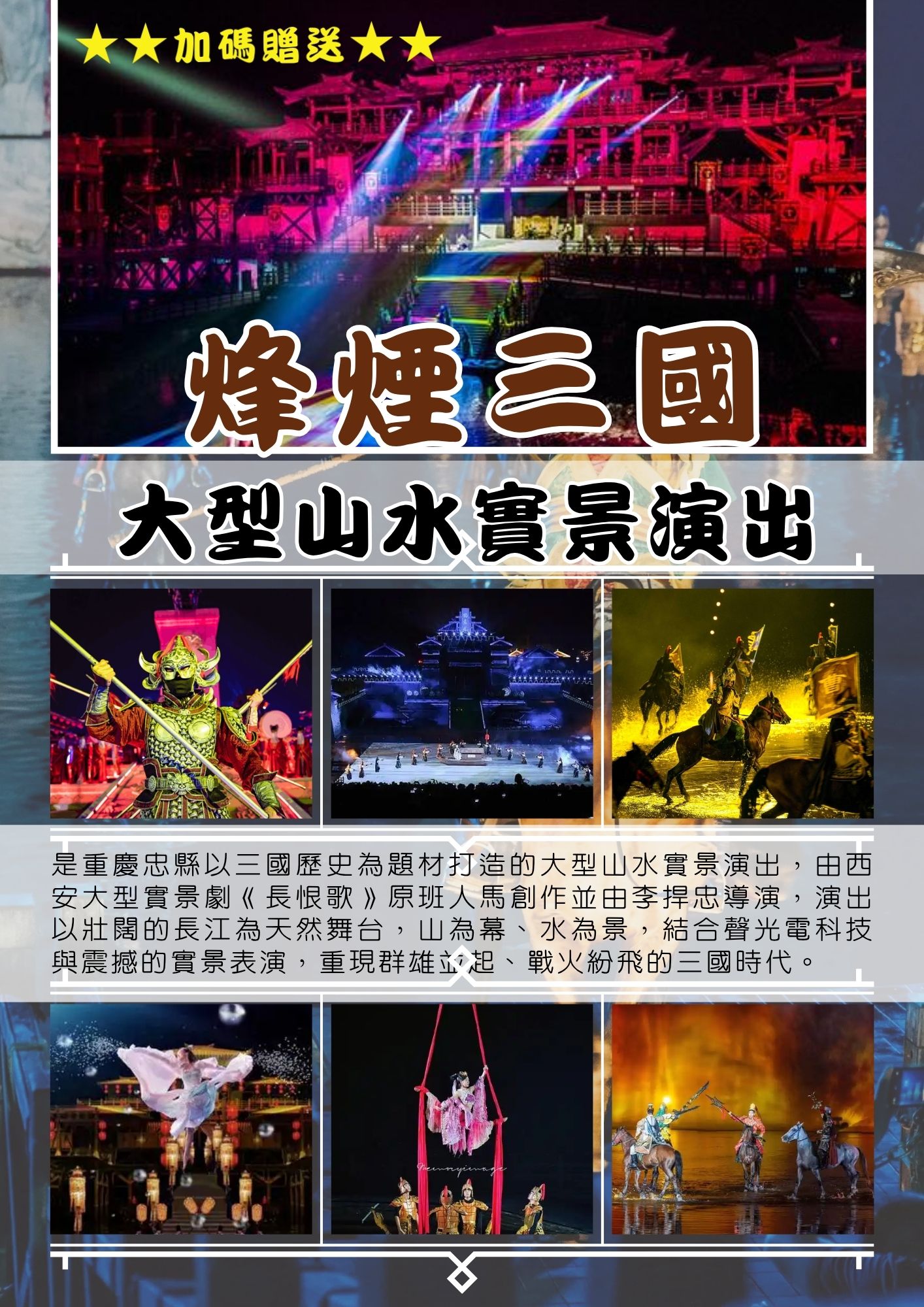 ★★加碼贈送★★李捍忠執導、以長江三峽為背景、三峽港灣為舞臺【大型山水實景演出《烽煙三國》】是重慶忠縣以三國歷史為題材打造的大型山水實景演出,由西安大型實景劇《長恨歌》原班人馬創作並由李捍忠導演,演出以壯闊的長江為天然舞台,山為幕、水為景,結合聲光電科技與磅礴的實景表演,重現群雄並起、戰火紛飛的三國時代。劇情以蜀漢名將張飛鎮守巴蜀、忠義護國的故事為主軸,融合關羽、劉備、諸葛亮等經典人物事蹟,透過火燒連營、萬馬奔騰、刀光劍影的震撼場景,展現「亂世出英雄」的豪邁氣勢。夜幕降臨時,山體投影與水上特效交相輝映,營造如夢似幻的戰場氛圍,觀眾彷彿穿越時空置身古戰場。配樂結合川劇、鼓陣與古風戰歌,既悲壯又激昂,讓人熱血沸騰。整場演出融合了劇情、表演、特效與江河自然景觀,將歷史與藝術完美結合,呈現出史詩般的視聽震撼,不僅是一場震撼視覺的史詩級表演,更是一場充滿忠義與家國情懷的文化盛宴,被譽為重慶最具震撼力的夜間實景秀,是遊覽三峽、走訪忠縣時絕不能錯過的經典演出。