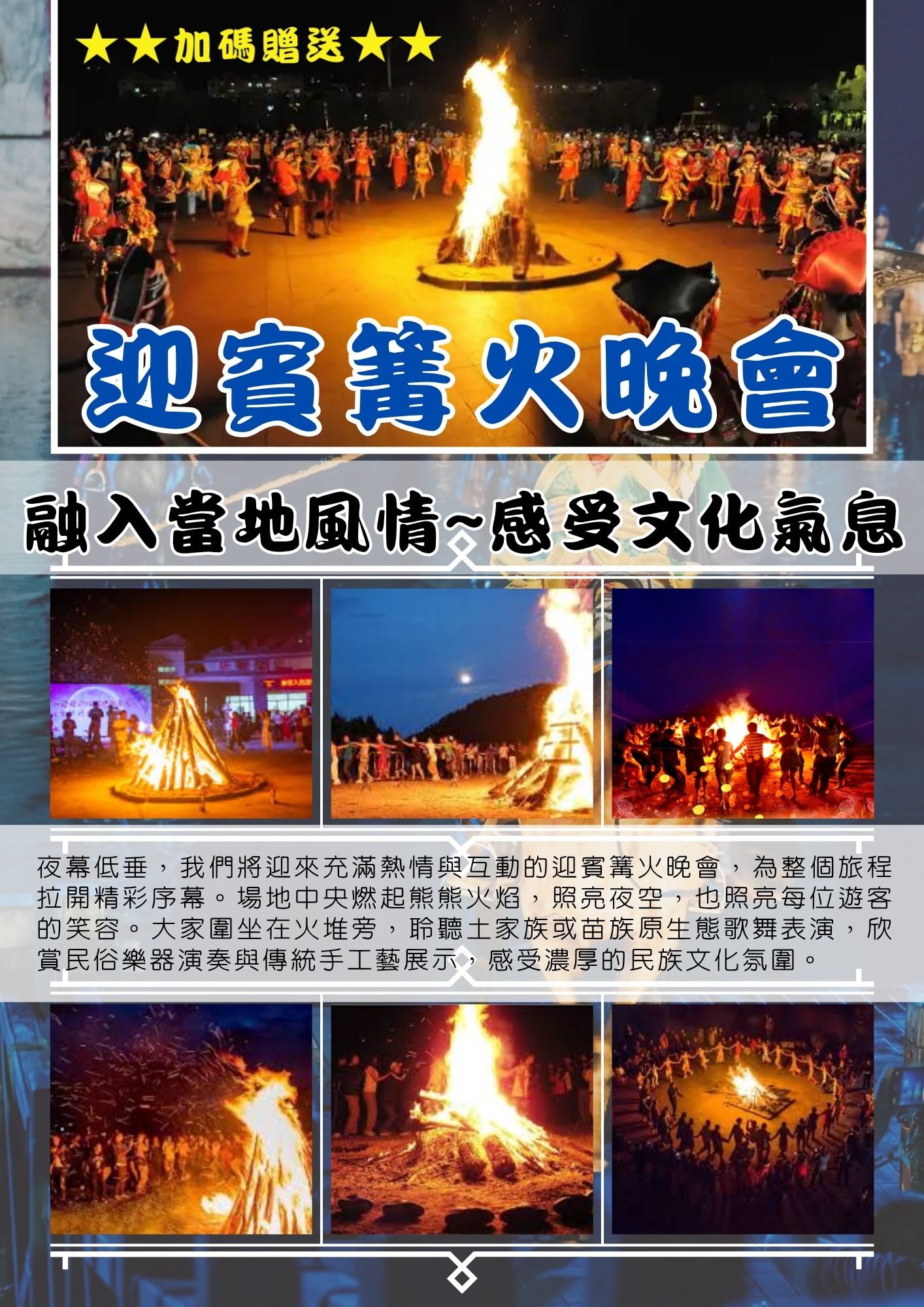 ★★加碼贈送【融入當地風情~感受文化氣息~迎賓篝火晚會】★★夜幕低垂,我們將迎來充滿熱情與互動的迎賓篝火晚會,為整個旅程拉開精彩序幕。場地中央燃起熊熊火焰,照亮夜空,也照亮每位遊客的笑容。大家圍坐在火堆旁,聆聽土家族或苗族原生態歌舞表演,欣賞民俗樂器演奏與傳統手工藝展示,感受濃厚的民族文化氛圍。不僅如此,還可以親自參與趣味互動遊戲,與當地居民一起載歌載舞,體驗最真實的生活樂趣,邊拍照邊留下旅行中的歡樂瞬間。篝火的暖光映照下,星空與煙霧交織,整個夜晚如同童話般夢幻。無論是朋友、家人還是旅遊團隊,每個人都能在這場晚會中找到屬於自己的歡樂與感動。迎賓篝火晚會不只是視覺和聽覺的盛宴,更是一種文化的沉浸與交流,讓遊客在熱鬧與溫暖中開啟旅程,留下難忘而美好的回憶。這樣的夜晚,不僅點燃身心,也拉近了與當地文化和人情的距離,成為整趟旅行中最生動、最溫暖的記憶之一。