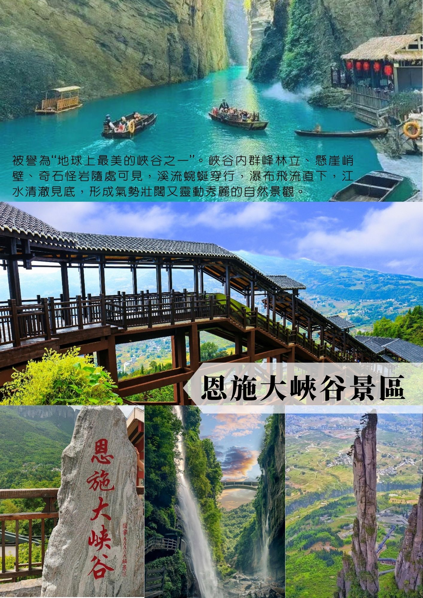 湖北人氣5A級景區:喀斯特地形地貌天然博物館美稱【恩施大峽谷景區】位於湖北恩施土家族苗族自治州西北部,是中國著名的喀斯特地貌景區,全長約108公里,縱深可達1,800米,被譽為“地球上最美的峽谷之一”。峽谷內群峰林立、懸崖峭壁、奇石怪岩隨處可見,溪流蜿蜒穿行,瀑布飛流直下,江水清澈見底,形成氣勢磅礴又靈動秀麗的自然景觀。林木茂密、植被覆蓋率高,春夏百花爭艷、綠意盎然,秋季山林染上金黃與火紅,冬季雲霧縈繞、冰雪交織,呈現四季變幻之美。遊客可乘觀光索道俯瞰全景,也可沿步道徒步探索幽深谷底,近距離欣賞瀑布群、溪流與懸崖奇石,感受大自然的壯麗與靈秀。景區內還保留豐富的民族文化,土家族與苗族的傳統村落、吊腳樓、民俗歌舞與手工藝品,為自然之美增添人文韻味。