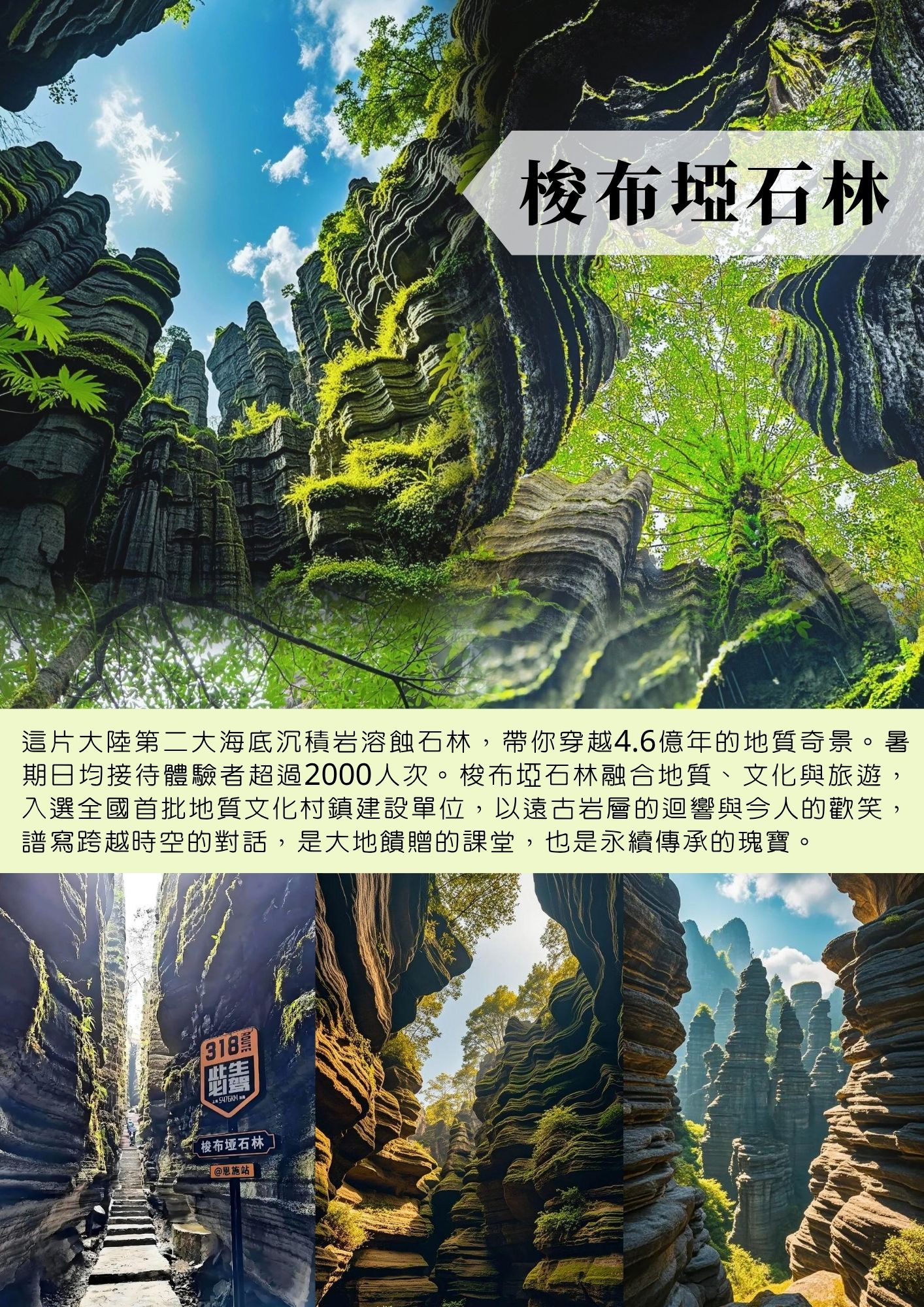 走進4.6億年前海底世界【梭布埡石林】這片大陸第二大海底沉積岩溶蝕石林,帶你穿越4.6億年的地質奇景。暑期日均接待體驗者超過2000人次。沿步行路線,遊客可欣賞原生態土家婚俗表演,從認識相愛、哭嫁到過火盆、背新娘,每個環節均依據民俗學者考證復原,演員服飾傳統工藝製作,讓非遺真正活起來。順著參觀路線進入犀牛溝,這條長200餘米、最窄僅40厘米的溶蝕裂隙峽谷,是奧陶紀淺海沉積的真實見證,波浪狀岩紋清晰可見,景區單向遊覽管制與解說牌保障安全與學習。梭布埡石林融合地質、文化與旅遊,入選全國首批地質文化村鎮建設單位,以遠古岩層的迴響與今人的歡笑,譜寫跨越時空的對話,是大地饋贈的課堂,也是永續傳承的瑰寶。
