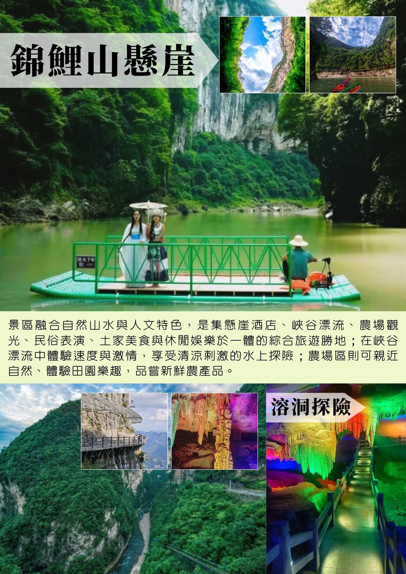 形狀酷似傳說中的吉祥之魚“錦鯉”而得名【錦鯉山懸崖風景區(含竹筏)】景區融合自然山水與人文特色,是集懸崖酒店、峽谷漂流、農場觀光、民俗表演、土家美食與休閒娛樂於一體的綜合旅遊勝地。遊客可在懸崖酒店俯瞰壯麗山谷與溪流,感受雲霧繚繞的仙境美景;在峽谷漂流中體驗速度與激情,享受清涼刺激的水上探險;農場區則可親近自然、體驗田園樂趣,品嘗新鮮農產品。景區還有原生態土家民俗表演,從歌舞到傳統手工藝,讓遊客深入了解土家文化,而土家特色美食更為整個旅程增添了地道風味。
