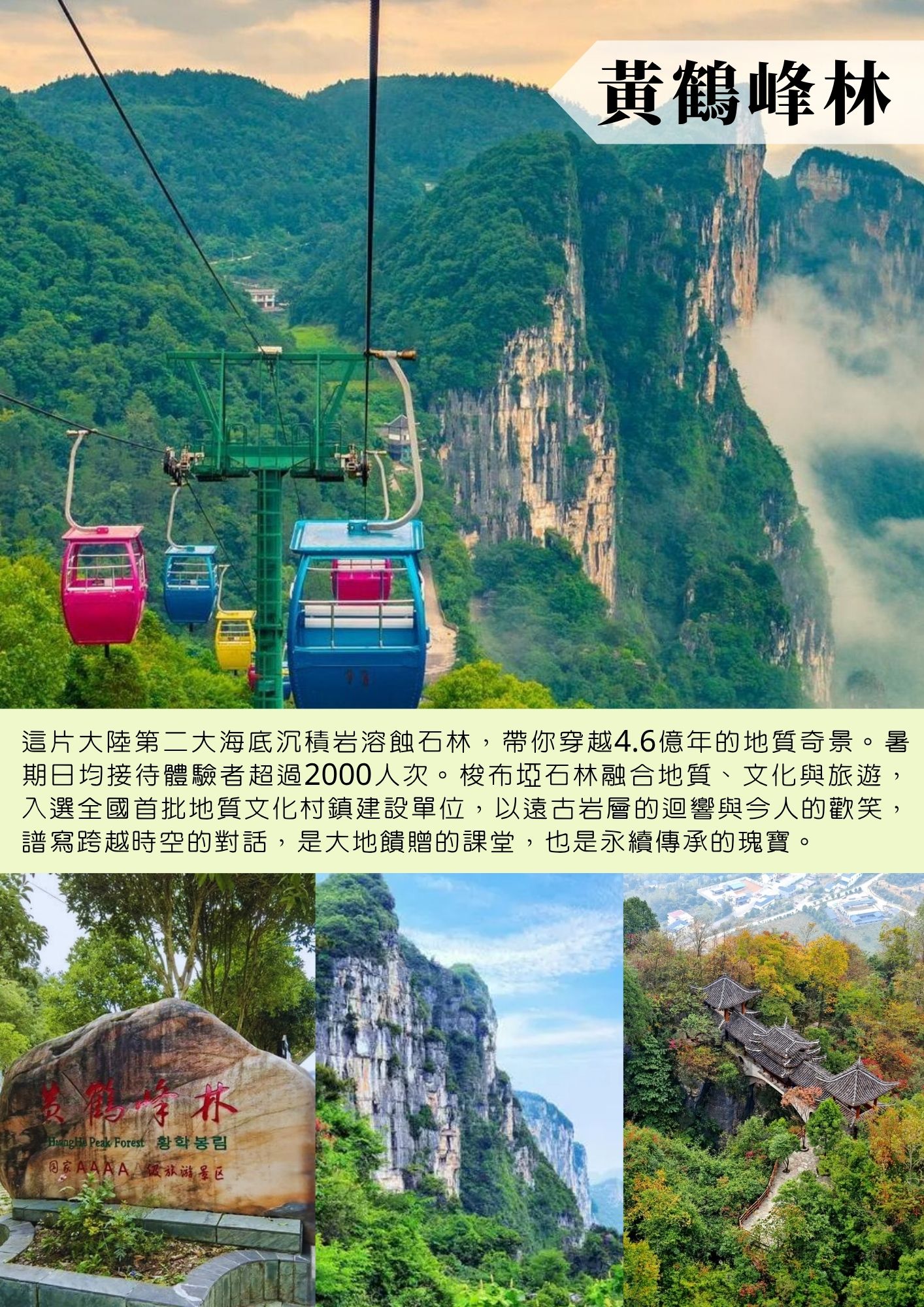 恩施周邊最具代表性的峰林景觀之一~雲頂之巔【黃鶴峰林(含單程纜車或電梯一趟)】毗鄰建始縣花坪鎮南部、清江北岸,是,也被譽為俯瞰恩施全景的最佳觀賞點。整片峰林奇峰林立,巍峨岩壁與奇形怪石錯落有致,遠望如翻滾的石浪,或像天然雕塑排列在山間,每座峰都獨具特色。景區海拔約1200至1300米,屬典型喀斯特峰林地貌,形成於約2.5億年前的三叠紀石灰岩層,經歷長時間地質演化,呈現出令人驚嘆的自然奇觀。黃鶴峰林核心景點豐富,包括群峰朝陽、絕壁雲海、一線天等20餘處地質景觀,被譽為“奇峰異石大觀園”,讓人置身其中仿佛走進天然雕刻的奇峰世界。遊客沿安全步道漫步,既可近距離欣賞奇峰造型,也能俯瞰清江及周邊山谷的壯麗景色。