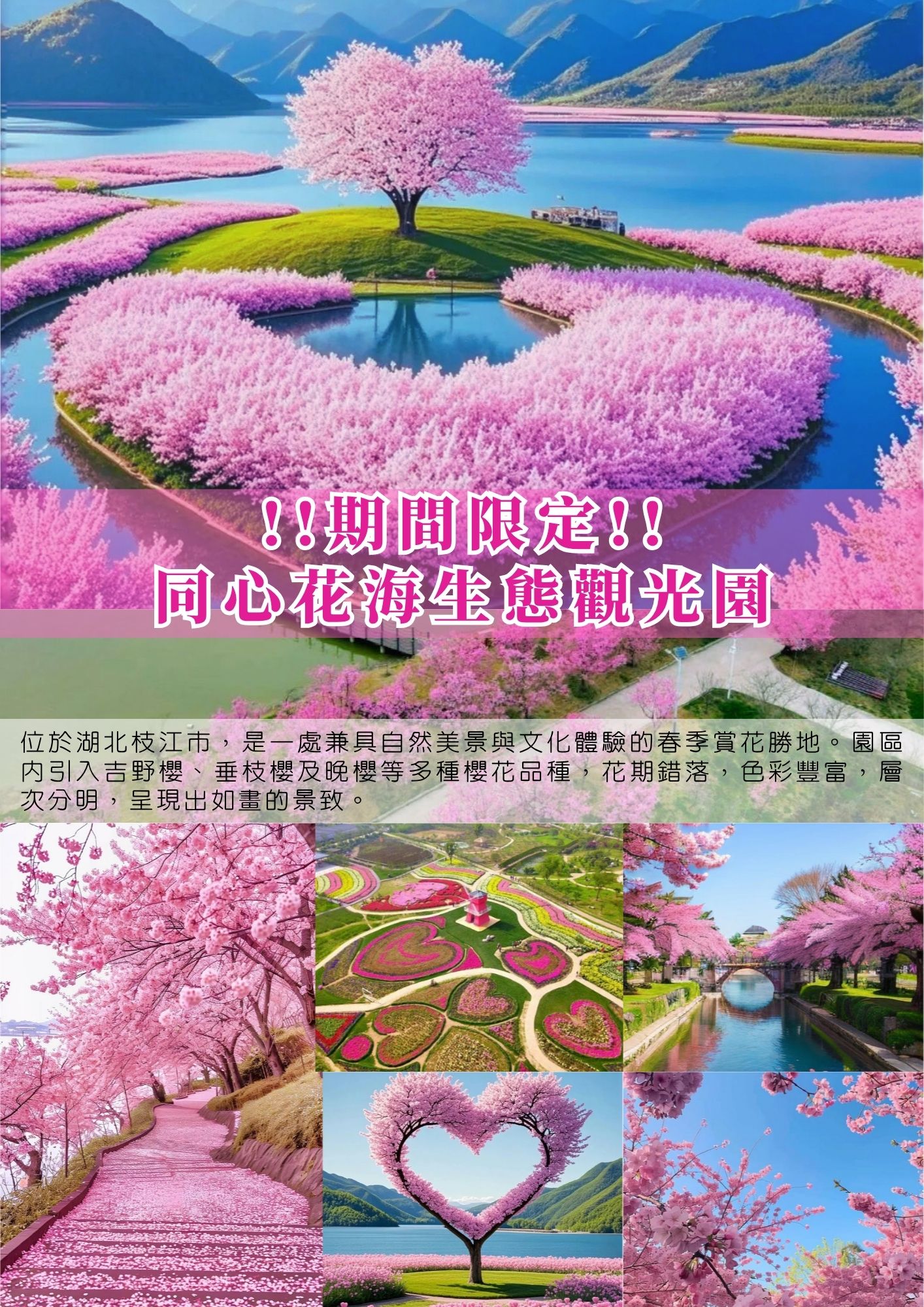 !!期間限定!!【同心花海生態觀光園~枝江大型櫻花園林:櫻花狂想曲~浪漫滿園500畝10萬株櫻花齊放】位於湖北枝江市,是一處兼具自然美景與文化體驗的春季賞花勝地。園區內引入吉野櫻、垂枝櫻及晚櫻等多種櫻花品種,花期錯落,色彩豐富,層次分明,呈現出如畫的景致。園林設計充分考慮遊覽動線,蜿蜒步道穿越花海,沿途設有觀景平台與休憩涼亭,方便遊客欣賞細膩的花瓣飄落與枝葉交錯的景象。園內還融合江城地域文化,規劃茶室、花藝展示及民俗文化小型展區,讓遊客在欣賞自然風光的同時,了解地方傳統工藝與文化特色。每年春季,櫻花盛開之際,園林舉辦櫻花節活動,包括花海巡遊、民俗表演與攝影比賽,提升遊客互動與體驗感。景區管理嚴謹,步道規劃合理、標識清楚,兼顧遊覽便利與植物保護。