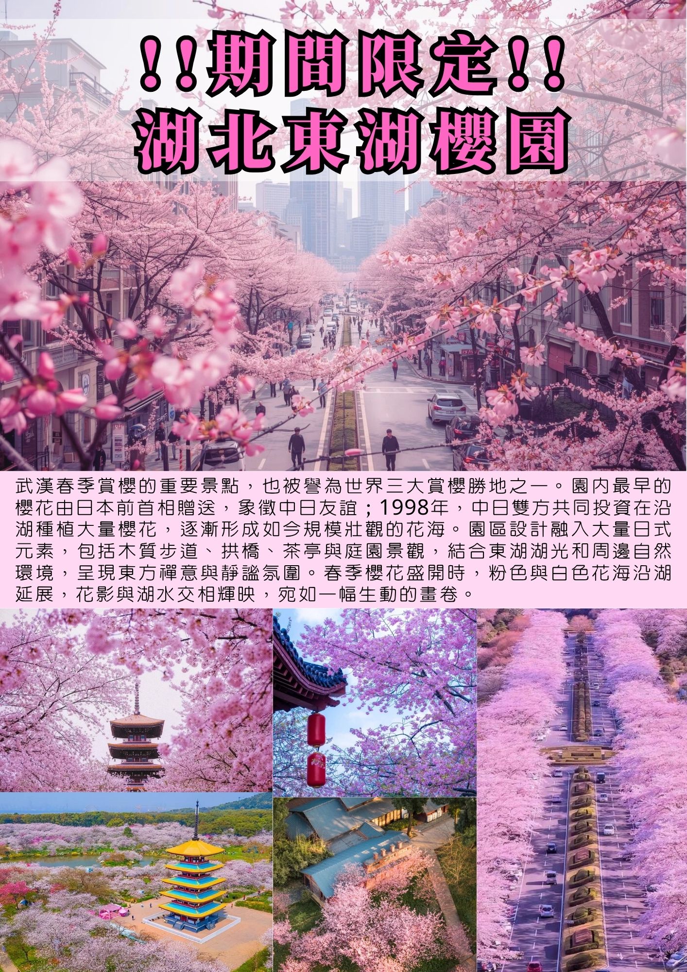 世界前三大之一【東湖櫻園】湖北東湖櫻園位於東湖風景區核心地帶,是武漢春季賞櫻的重要景點,也被譽為世界三大賞櫻勝地之一。園內最早的櫻花由日本前首相贈送,象徵中日友誼;1998年,中日雙方共同投資在沿湖種植大量櫻花,逐漸形成如今規模壯觀的花海。園區設計融入大量日式元素,包括木質步道、拱橋、茶亭與庭園景觀,結合東湖湖光和周邊自然環境,呈現東方禪意與靜謐氛圍。春季櫻花盛開時,粉色與白色花海沿湖延展,花影與湖水交相輝映,宛如一幅生動的畫卷。園內植有數十種櫻花品種,不同品種的花期錯落,使賞花期可持續數週。除了櫻花景觀,園區規劃完善,設有綠道、植物園、聽濤景區及藝術露營地,提供騎行、徒步、休閒與藝術活動等多元體驗,適合各類遊客前往。尤其是沿湖的步道與特色景觀點,將湖光山色與人文設計巧妙結合,營造輕鬆愉悅的遊園氛圍。無論是春季踏青、自然觀賞或短途休閒,園區都能滿足不同需求,展現城市與自然的和諧共生,是武漢春季旅遊不可錯過的經典地標。