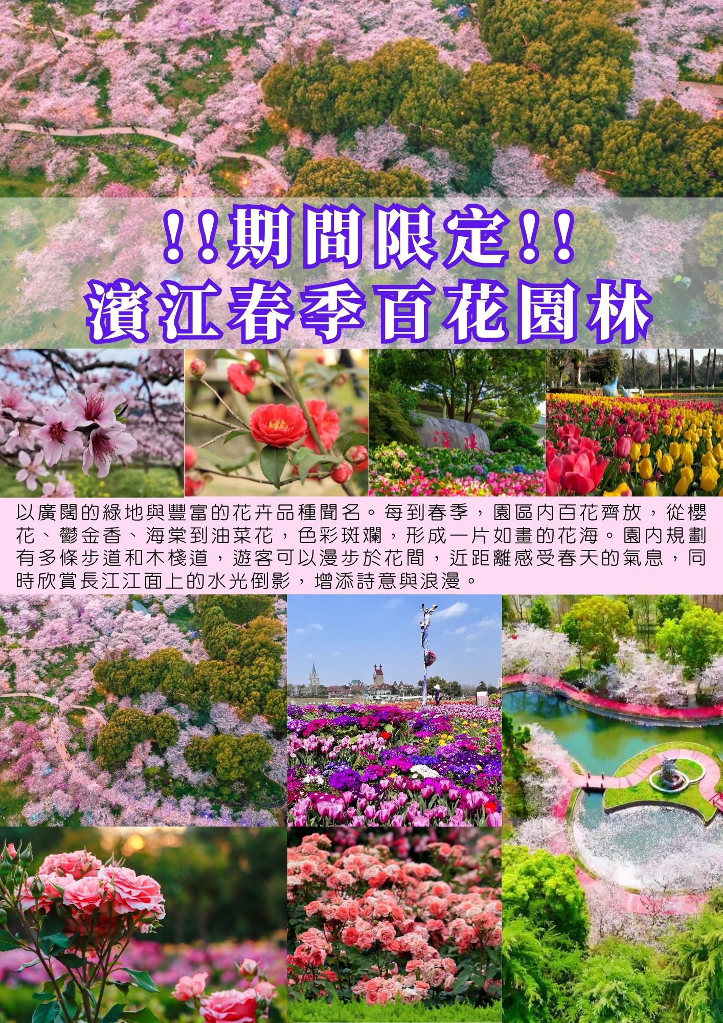 !!期間限定!!長江沿岸的核心景區【濱江春季百花園林】以廣闊的綠地與豐富的花卉品種聞名。每到春季,園區內百花齊放,從櫻花、鬱金香、海棠到油菜花,色彩斑斕,形成一片如畫的花海。園內規劃有多條步道和木棧道,遊客可以漫步於花間,近距離感受春天的氣息,同時欣賞長江江面上的水光倒影,增添詩意與浪漫。內定期舉辦花卉節與春季活動,提供互動體驗,如花藝展示、親子遊樂及攝影打卡點,讓遊客不僅欣賞美景,更能融入花海樂趣。長江濱江春季百花園林的園藝設計注重生態與可持續性,利用不同花期的植物搭配,延長賞花季節,讓春日遊客持續享受視覺盛宴。