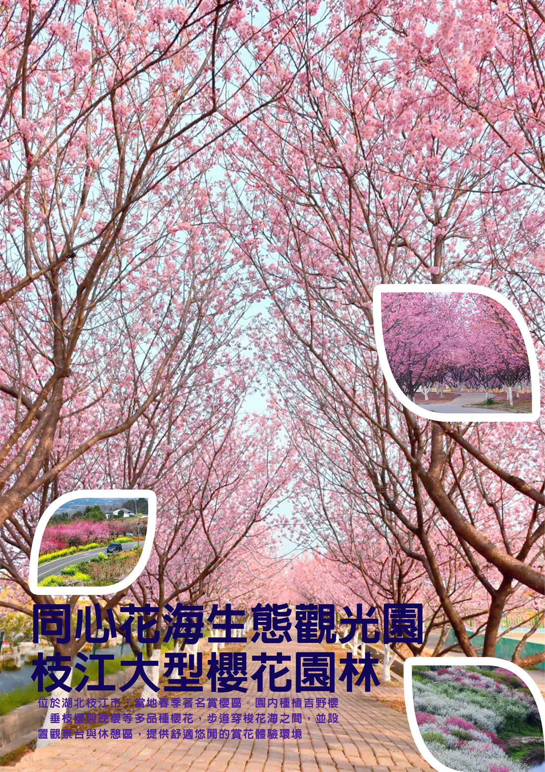 第二天【武漢-枝江-宜昌】早餐後前往→楚風水韻與森林花海完美結合生態園區【仙桃夢裏水鄉(含水上森林遊船+花海)】+++前往枝江約1.5H→!!期間限定!!【同心花海生態觀光園~枝江大型櫻花園林:櫻花狂想曲~浪漫滿園500畝10萬株櫻花齊放→+++前往宜昌約1H→晚餐後前往華夏神女3號登船