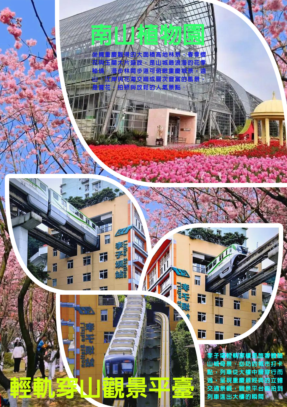 近距離感受列車穿梭動態景象【輕軌穿山關鍵平臺】重慶的輕軌系統獨樹一格,其中穿山平臺是城市特色的重要象徵。列車從山間隧道或高架橋穿過,經過居民樓與城市建築,形成「列車穿樓」的奇特景觀。遊客站在平臺上,還能俯瞰城市蜿蜒的山路與江河交匯的景致。平臺四周的山坡與江岸相映成趣,展現重慶立體城市的魅力。這裡不僅是交通樞紐,更是拍照打卡的熱門景點,無論白天觀賞列車運行的震撼畫面,還是傍晚欣賞江景與城市輪廓的光影,都能體驗到山城獨特的韻味。