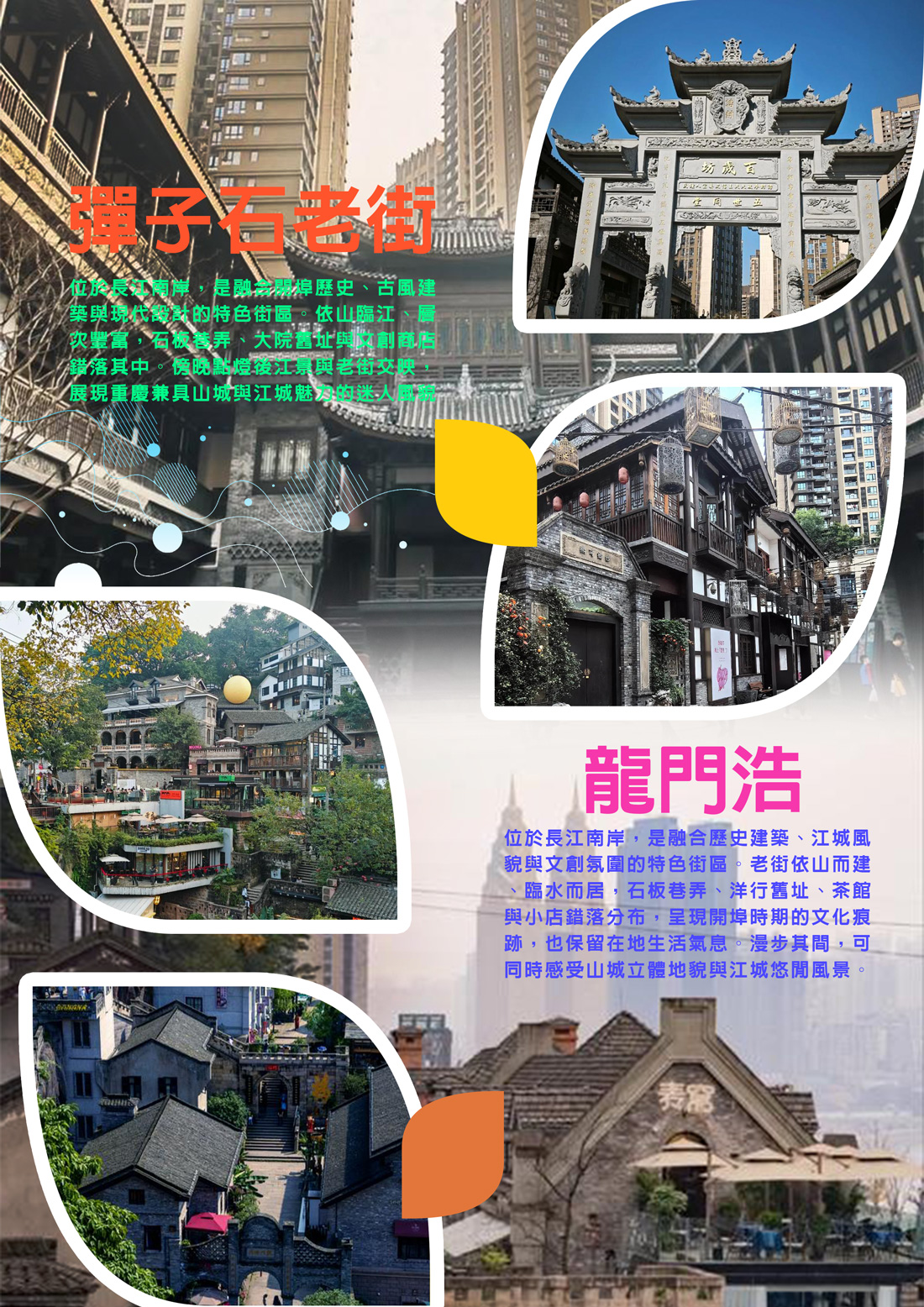 承載碼頭記憶與山城生活的江岸老街【彈子石老街】彈子石老街的形成與長江航運密切相關,早在清末民初便因江岸碼頭與水路交通而逐漸發展,成為南岸重要的居民聚落與物資集散地。早期街區承載著碼頭裝卸、商貿往來與市民日常生活功能,是重慶沿江城市發展的縮影之一。街道順應山勢鋪展,形成階梯式巷道與臨江建築並存的空間格局,充分體現山城依地形而建的城市特性。隨著近代航運型態改變與城市發展重心轉移,彈子石一帶逐漸淡出主要商業舞台,因此保留下較完整的街巷結構與老式民居。傳統建築、石階小巷與沿江視野,共同構成具有生活溫度的老城風貌。近年經整體修復與再利用,街區在維持原有空間尺度的基礎上,融入文化展示與公共活動機能,使彈子石老街得以延續重慶沿江聚落的歷史脈絡,保存山城生活型態的真實樣貌。