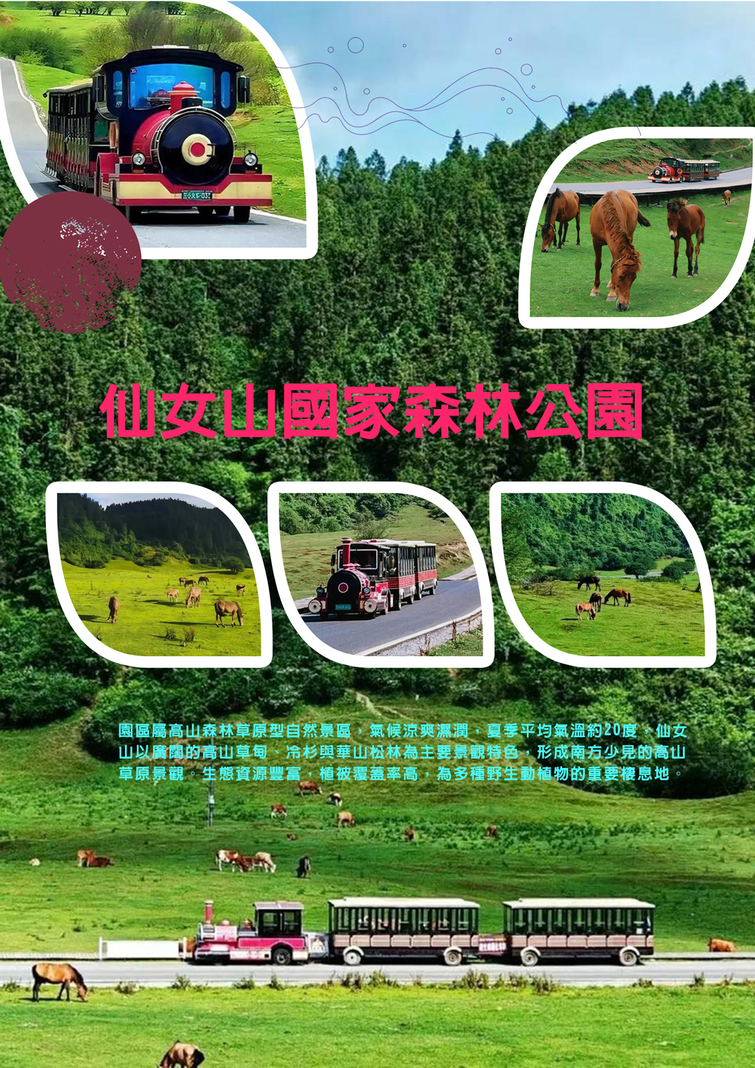 搭乘森林小火車穿越草原與林海【仙女山國家森林公園(含小火車)】地處武陵山脈中段,距武隆城區約30公里,園區總面積約8,900公頃,平均海拔約1,900公尺。園區屬高山森林草原型自然景區,氣候涼爽濕潤,夏季平均氣溫明顯低於市區,具有典型高山氣候特徵。仙女山以廣闊草甸、高山森林與起伏丘陵地形為主要景觀,形成南方地區較為少見的高山草原風貌。園內植被種類豐富,森林覆蓋率高,為多種野生動植物的重要棲息地。冬季受地形與氣候影響,常出現霧凇、降雪等自然現象。仙女山為武隆喀斯特地貌體系的重要組成部分,與天生三橋、芙蓉洞等景觀共同構成武隆喀斯特世界自然遺產區。