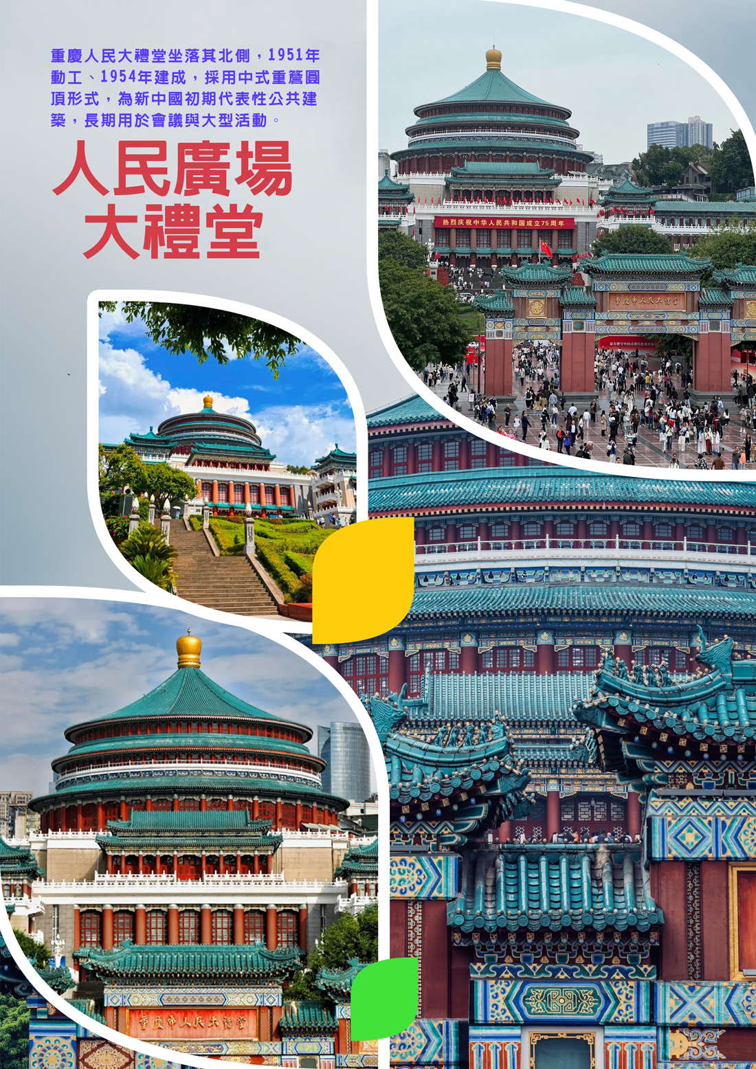 融合傳統宮殿形式與現代結構的代表性公共建築【重慶人民大禮堂】興建背景可追溯至1950年代初期。隨著重慶成為西南地區的重要行政與城市中心,原有公共設施已無法滿足大型集會與公共活動需求,因而規劃興建具代表性的公共建築群。1951年起,相關單位決定於渝中區馬鞍山一帶興建大禮堂,並與周邊文化、體育設施共同構成當時重慶的重要城市建設計畫。大禮堂建築設計融合中國傳統宮殿式風格與現代結構技術,外觀以圓形穹頂為主體,造型參考天壇、祈年殿及近代紀念性建築形式。屋頂採鋼網殼結構,規模宏大,內部空間可容納四千餘人。整體建築中軸對稱,搭配柱廊、台基與琉璃瓦屋頂,展現鮮明的時代建築特色。工程於1954年完工,1955年正式定名為「重慶人民大禮堂」。其建築形式與規模在新中國初期公共建築中具代表性,曾被列為全國重要建築之一,亦為研究20世紀中期中國公共建築與城市發展的重要實例。