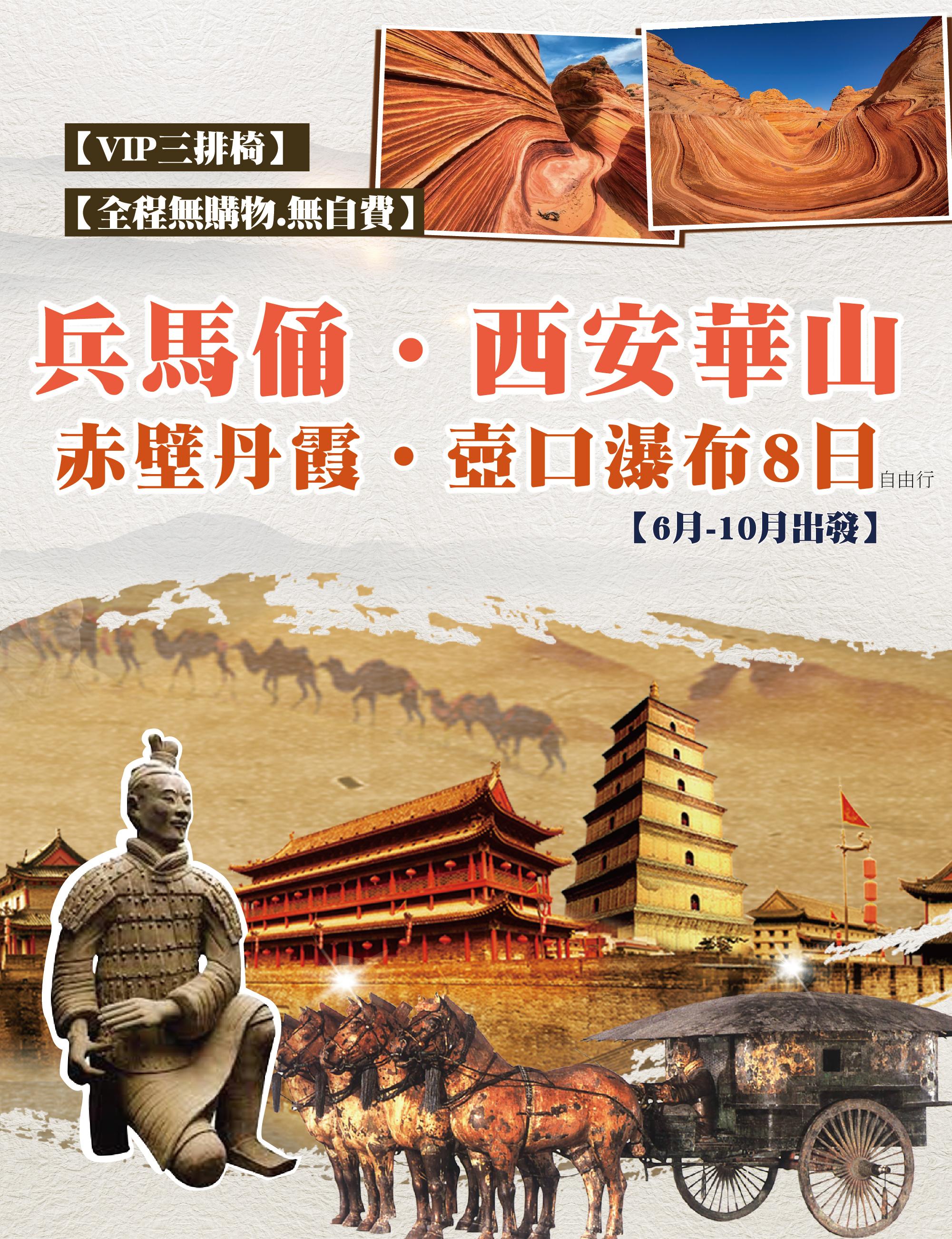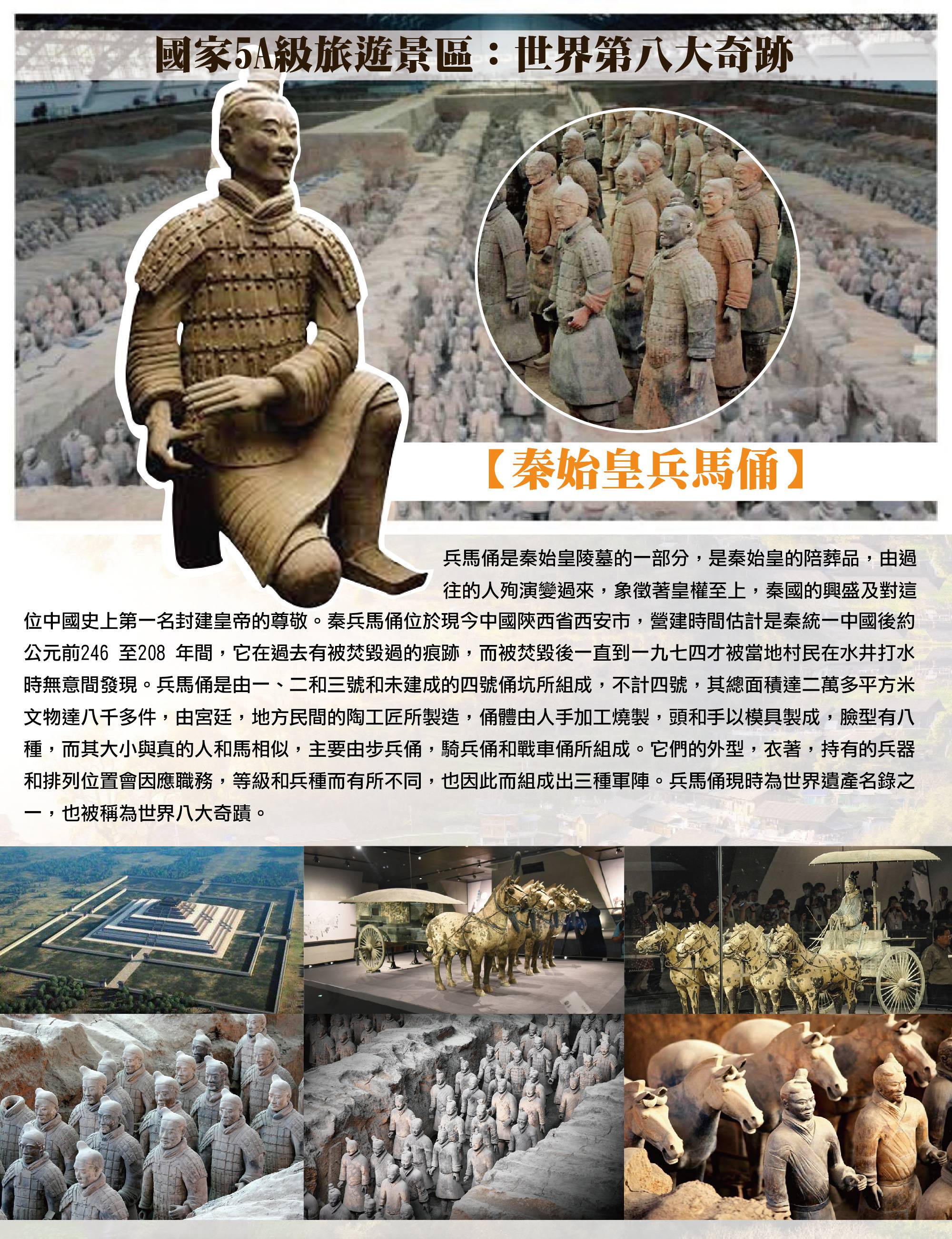 沉睡兩千年不滅帝國軍團【秦始皇兵馬俑(含景區電瓶車接駁+藍芽導覽耳機每人一副)】位於中國陝西省西安市臨潼區,是秦始皇陵園的重要陪葬坑之一,也是20世紀最偉大的考古發現之一,被譽為「世界第八大奇蹟」。兵馬俑始建於公元前3世紀秦始皇統一六國期間,用以模擬龐大的地下軍隊,象徵皇帝在死後仍擁有守護帝國的力量。整個遺址目前已發現多個俑坑,其中以一號坑規模最大,展現步兵與戰車組成的龐大軍陣,場面恢宏壯觀。兵馬俑每一尊陶俑皆為真人比例製作,面貌、髮型、神情與服飾均有所不同,呈現高度寫實的工藝水準,展現秦代雕塑藝術與軍事制度的嚴謹。考古研究顯示,這些陶俑原本彩繪鮮豔,但出土後因氧化而褪色,仍可見其精細工藝與歷史價值。除了士兵外,還有車兵、弓弩手與軍官等不同兵種,反映秦代完整的軍隊編制體系。整個兵馬俑遺址不僅具有極高的歷史與考古價值,也展現秦始皇追求「千古一帝」的宏大格局與古代中國高度發展的工藝技術。如今已成為世界著名文化遺產與旅遊景點,每年吸引大量遊客前來參觀,是了解中國古代文明與秦朝歷史的重要窗口。