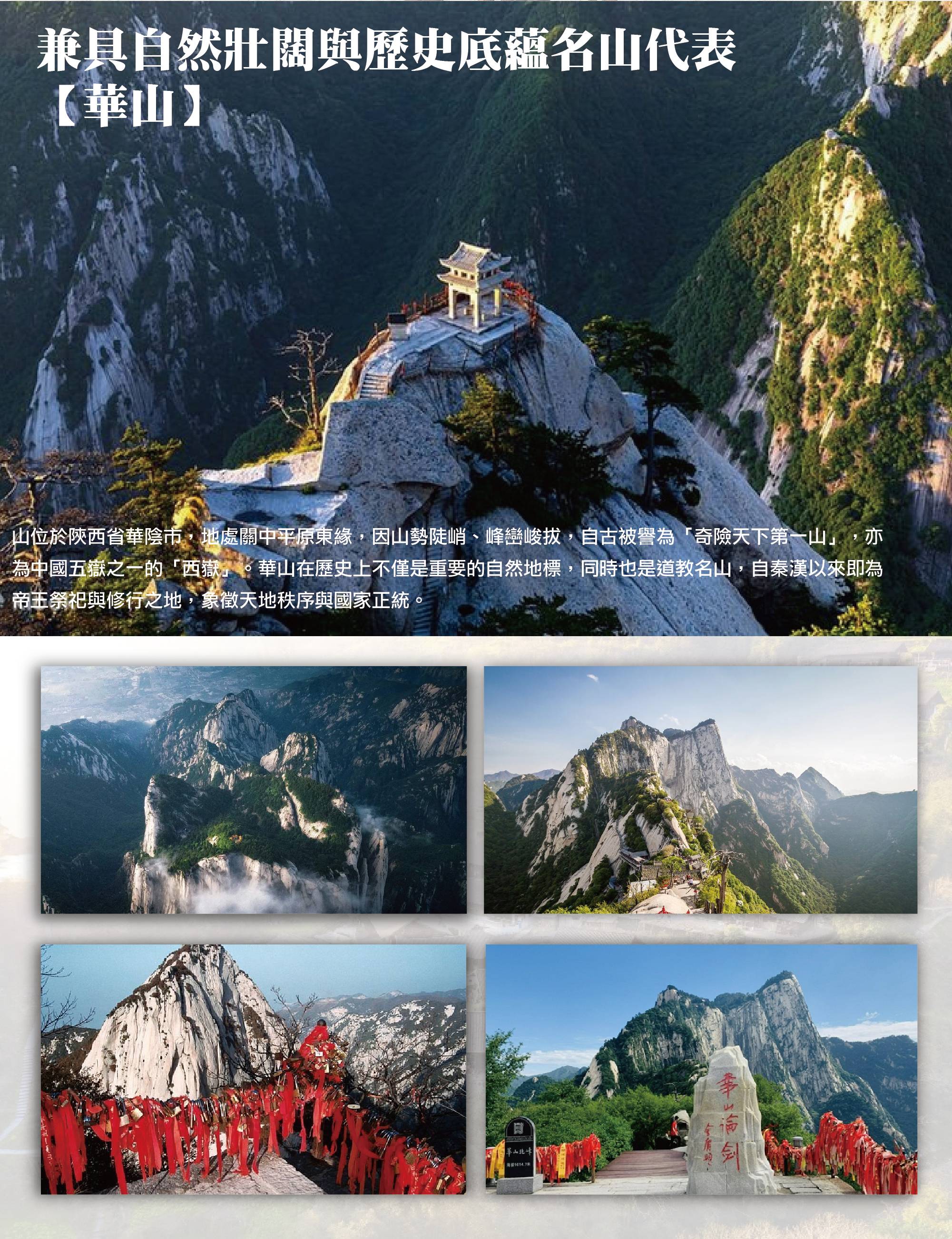 兼具自然壯闊與歷史底蘊名山代表【華山】山位於陝西省華陰市,地處關中平原東緣,因山勢陡峭、峰巒峻拔,自古被譽為「奇險天下第一山」,亦為中國五嶽之一的「西嶽」。華山在歷史上不僅是重要的自然地標,同時也是道教名山,自秦漢以來即為帝王祭祀與修行之地,象徵天地秩序與國家正統。華山主峰群由北峰、東峰、西峰、南峰與中峰組成,其中北峰地勢相對平緩,為現今主要登山與觀景入口。透過北峰索道上山,可俯瞰關中平原與群峰稜線,感受華山雄偉壯闊的地形特色。山體以花崗岩構成,長年風化切割形成刀削般峭壁與狹窄山脊,造就華山獨具一格的險峻景觀。華山亦因古道、棧道與險關聞名,歷代文人與修行者在此留下大量碑刻與傳說,使自然景觀與人文信仰交織成華山獨有的精神象徵,登臨群峰之際,可近距離欣賞華山陡峭岩壁與遼闊視野,感受名山獨有的氣勢與風貌。