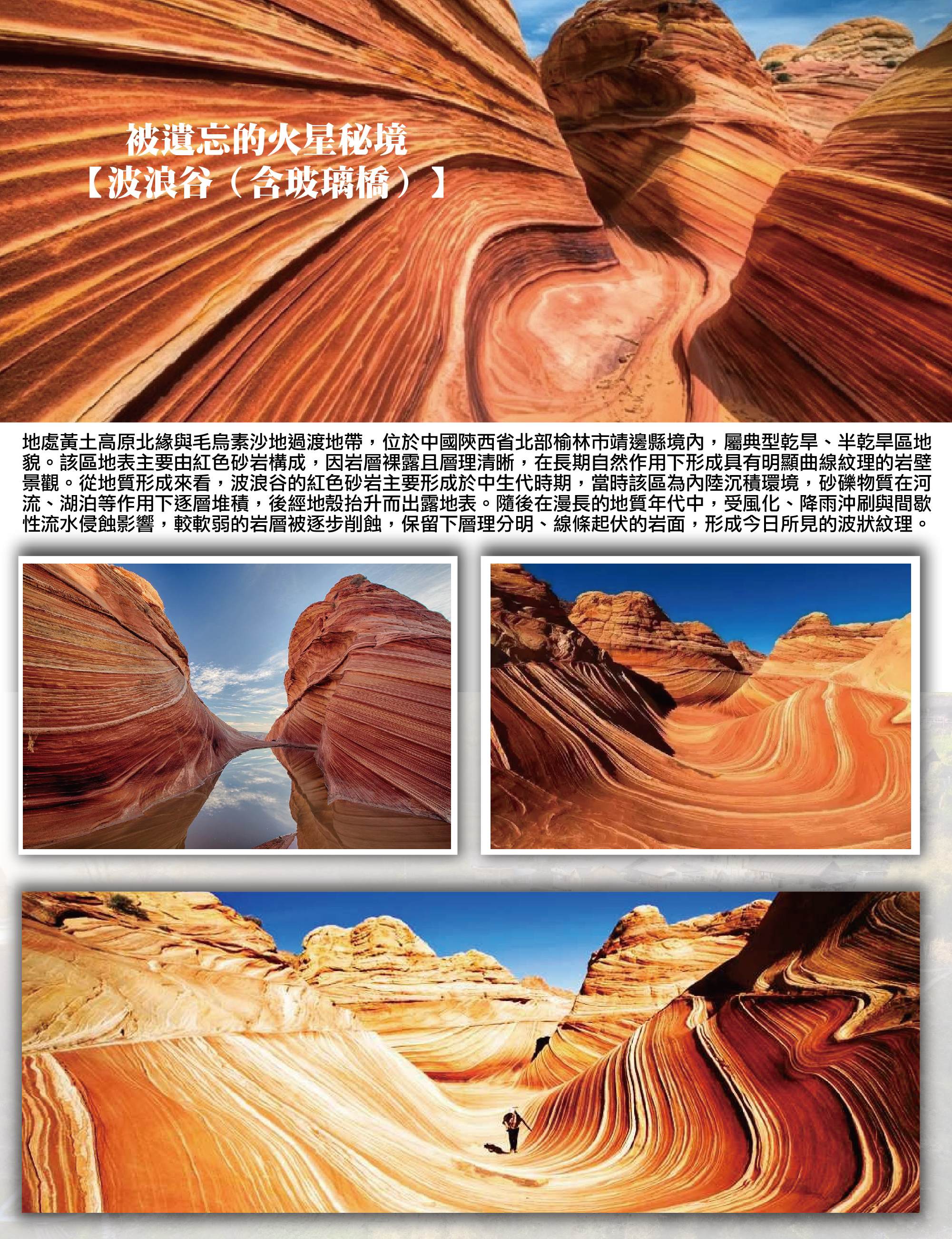 被遺忘的火星秘境【波浪谷(含玻璃橋)】地處黃土高原北緣與毛烏素沙地過渡地帶,位於中國陝西省北部榆林市靖邊縣境內,屬典型乾旱、半乾旱區地貌。該區地表主要由紅色砂岩構成,因岩層裸露且層理清晰,在長期自然作用下形成具有明顯曲線紋理的岩壁景觀。從地質形成來看,波浪谷的紅色砂岩主要形成於中生代時期,當時該區為內陸沉積環境,砂礫物質在河流、湖泊等作用下逐層堆積,後經地殼抬升而出露地表。隨後在漫長的地質年代中,受風化、降雨沖刷與間歇性流水侵蝕影響,較軟弱的岩層被逐步削蝕,保留下層理分明、線條起伏的岩面,形成今日所見的波狀紋理。在地貌分類上,靖邊波浪谷屬紅砂岩丹霞地貌的一種類型,與中國南方常見的丹霞地形不同,其色澤較為內斂,地形起伏幅度較小,呈現出層層堆疊、線條連續的岩層結構。由於位處黃土高原與沙地交會區,風蝕作用在地貌塑造中佔有相當比例,使岩面紋理更加清晰。從區域地理角度而言,靖邊波浪谷所在位置長期處於農牧交錯與邊防地帶,人類活動相對有限,使地表岩層得以大面積保存。近年經地質調查與保護規劃後,該區被納入自然景觀景區範圍,作為陝北地區具有代表性的地質地貌展示區。