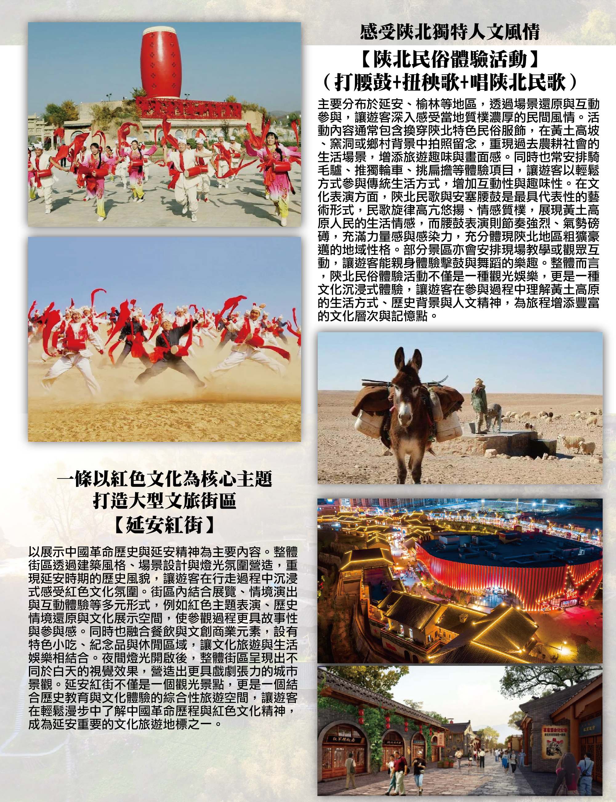 感受陝北獨特人文風情【陝北民俗體驗活動(打腰鼓+扭秧歌+唱陝北民歌)】主要分布於延安、榆林等地區,透過場景還原與互動參與,讓遊客深入感受當地質樸濃厚的民間風情。活動內容通常包含換穿陝北特色民俗服飾,在黃土高坡、窯洞或鄉村背景中拍照留念,重現過去農耕社會的生活場景,增添旅遊趣味與畫面感。同時也常安排騎毛驢、推獨輪車、挑扁擔等體驗項目,讓遊客以輕鬆方式參與傳統生活方式,增加互動性與趣味性。在文化表演方面,陝北民歌與安塞腰鼓是最具代表性的藝術形式,民歌旋律高亢悠揚、情感質樸,展現黃土高原人民的生活情感,而腰鼓表演則節奏強烈、氣勢磅礡,充滿力量感與感染力,充分體現陝北地區粗獷豪邁的地域性格。部分景區亦會安排現場教學或觀眾互動,讓遊客能親身體驗擊鼓與舞蹈的樂趣。整體而言,陝北民俗體驗活動不僅是一種觀光娛樂,更是一種文化沉浸式體驗,讓遊客在參與過程中理解黃土高原的生活方式、歷史背景與人文精神,為旅程增添豐富的文化層次與記憶點。