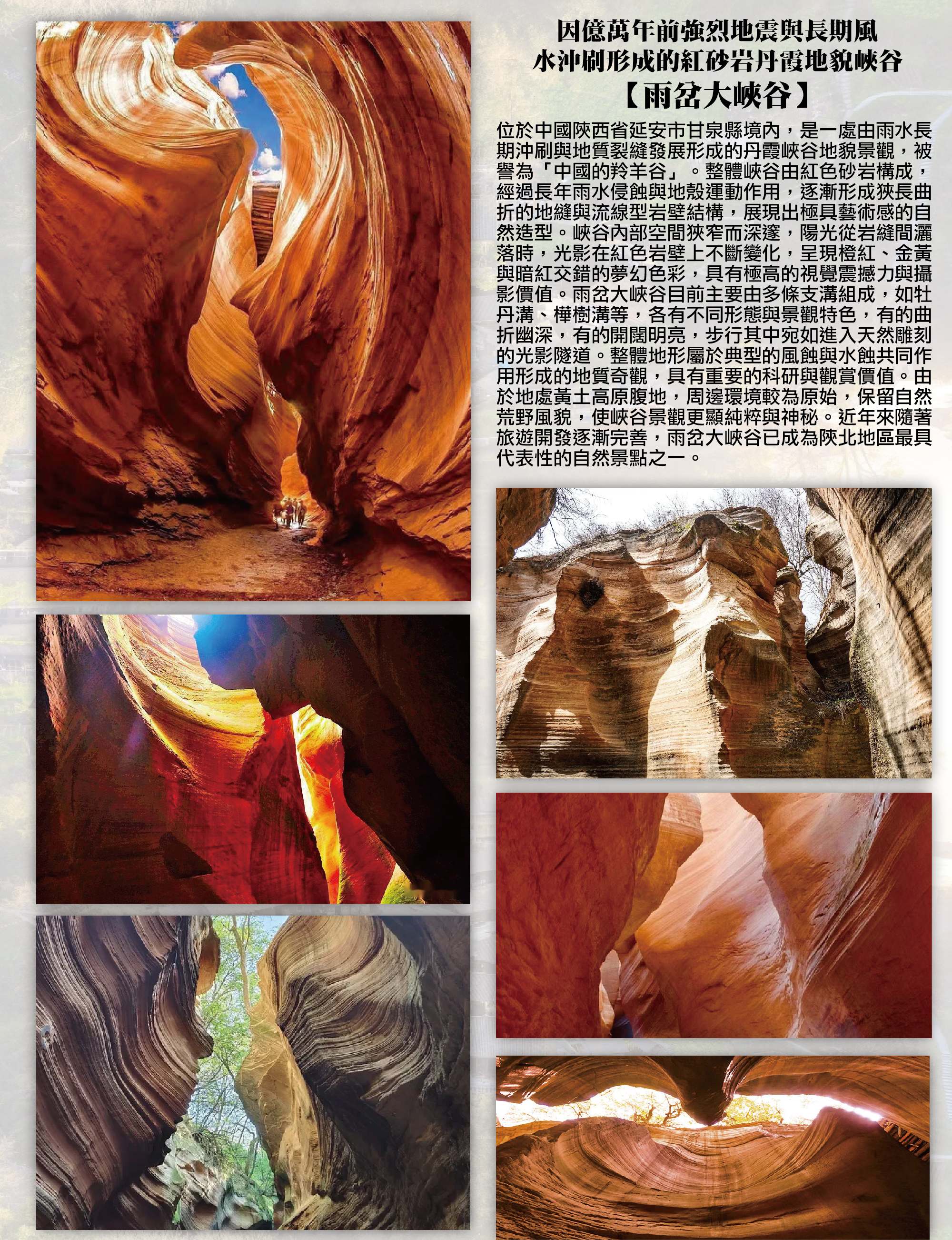 因億萬年前強烈地震與長期風水沖刷形成的紅砂岩丹霞地貌峽谷【雨岔大峽谷(區間車)】位於中國陝西省延安市甘泉縣境內,是一處由雨水長期沖刷與地質裂縫發展形成的丹霞峽谷地貌景觀,被譽為「中國的羚羊谷」。整體峽谷由紅色砂岩構成,經過長年雨水侵蝕與地殼運動作用,逐漸形成狹長曲折的地縫與流線型岩壁結構,展現出極具藝術感的自然造型。峽谷內部空間狹窄而深邃,陽光從岩縫間灑落時,光影在紅色岩壁上不斷變化,呈現橙紅、金黃與暗紅交錯的夢幻色彩,具有極高的視覺震撼力與攝影價值。雨岔大峽谷目前主要由多條支溝組成,如牡丹溝、桦树沟等,各有不同形態與景觀特色,有的曲折幽深,有的開闊明亮,步行其中宛如進入天然雕刻的光影隧道。整體地形屬於典型的風蝕與水蝕共同作用形成的地質奇觀,具有重要的科研與觀賞價值。由於地處黃土高原腹地,周邊環境較為原始,保留自然荒野風貌,使峽谷景觀更顯純粹與神秘。近年來隨著旅遊開發逐漸完善,雨岔大峽谷已成為陝北地區最具代表性的自然景點之一。