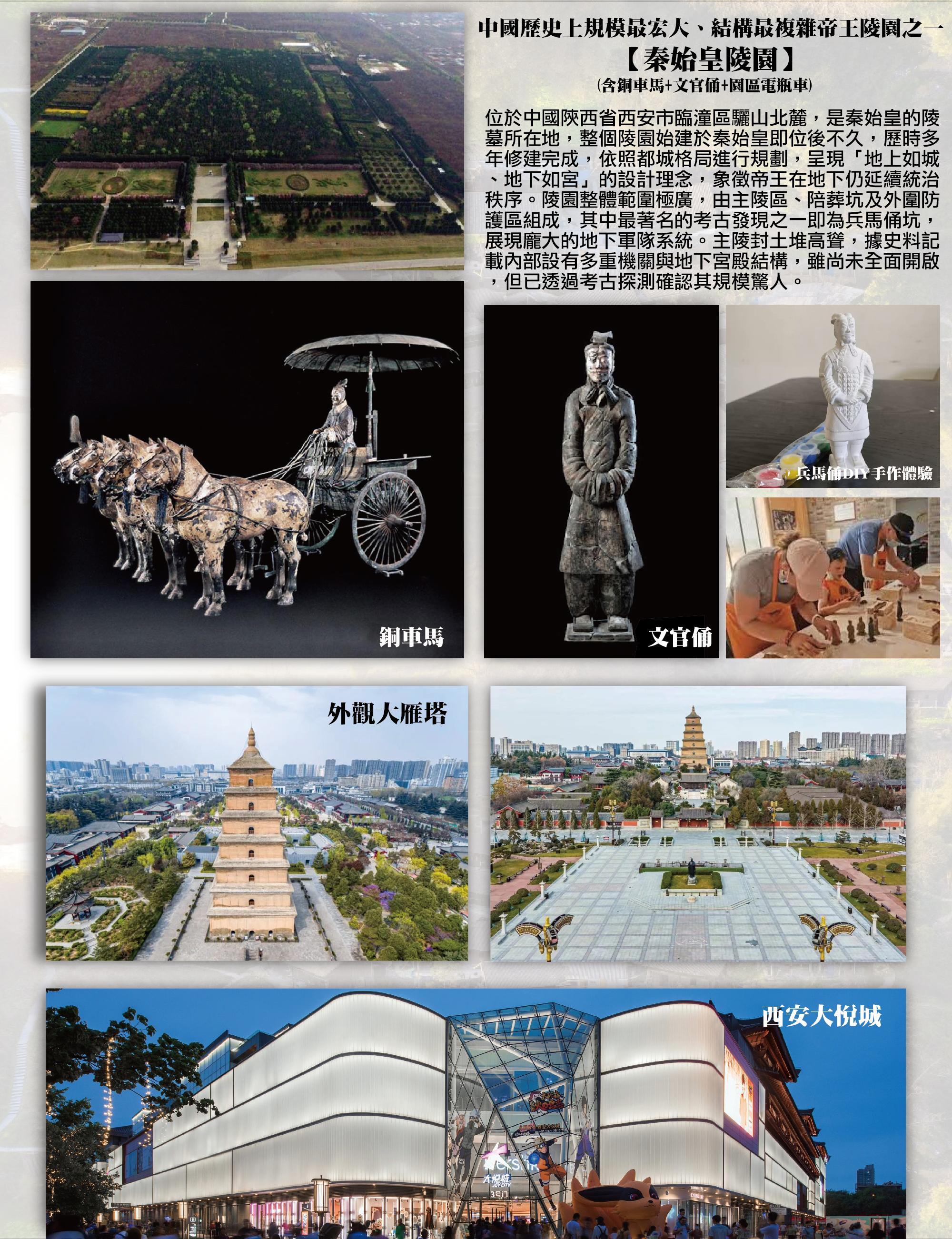 中國歷史上規模最宏大、結構最複雜帝王陵園之一【秦始皇陵園(含銅車馬+文官俑+園區電瓶車)】位於中國陝西省西安市臨潼區驪山北麓,是秦始皇的陵墓所在地,整個陵園始建於秦始皇即位後不久,歷時多年修建完成,依照都城格局進行規劃,呈現「地上如城、地下如宮」的設計理念,象徵帝王在地下仍延續統治秩序。陵園整體範圍極廣,由主陵區、陪葬坑及外圍防護區組成,其中最著名的考古發現之一即為兵馬俑坑,展現龐大的地下軍隊系統。主陵封土堆高聳,據史料記載內部設有多重機關與地下宮殿結構,雖尚未全面開啟,但已透過考古探測確認其規模驚人。周邊還分布大量陪葬坑與遺跡,反映秦代皇權制度與喪葬文化的高度發展。整個陵園融合政治權力象徵、軍事制度與宗教信仰概念,不僅展現秦始皇統一六國後的雄心與威望,也代表中國古代帝王陵墓制度的最高水準。如今,秦始皇陵園已被列為世界文化遺產,是研究秦代歷史與古代中國文明的重要遺址之一。