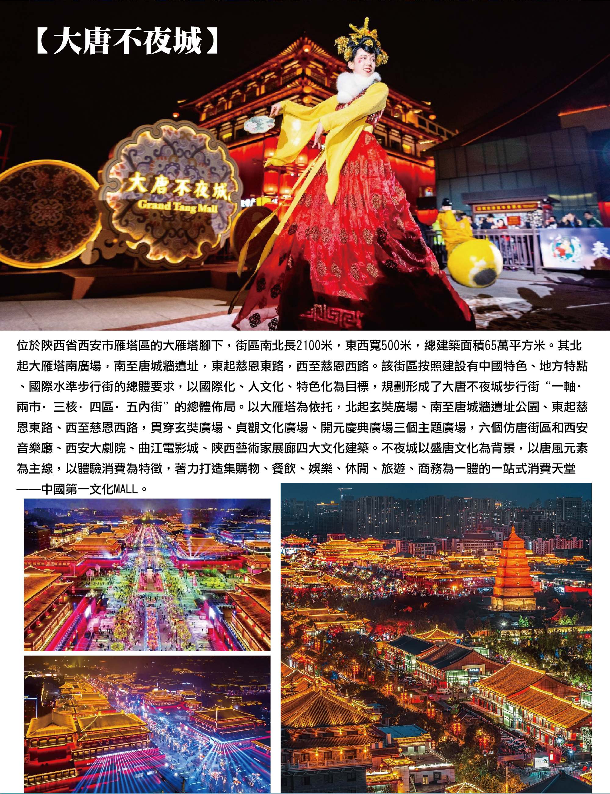盛唐文化為核心打造大型沉浸式步行街區【大唐不夜城】位於中國陝西省西安市雁塔區,整體外觀以「盛唐文化」為設計主軸,是一條結合古風建築與現代燈光藝術的大型步行街區。白天可見仿唐式建築群整齊排列,屋簷飛翹、朱紅與金色為主調,搭配石雕欄杆與寬敞中軸步道,呈現出恢弘大氣的古都格局。夜幕降臨後,大唐不夜城的外觀風格轉為燈光主導,整條街區被暖色系燈光點亮,建築輪廓更加立體清晰,形成層次分明的視覺效果。主街兩側設有大型景觀雕塑與文化裝置,如唐代人物、詩詞意象與歷史主題造景,使整體空間更具故事性與沉浸感。街區中央寬闊的步行軸線搭配景觀水池與開放廣場,使視野延伸感強烈,白天展現古都恢宏氣勢,夜晚則轉化為光影交錯的城市舞台。整體外觀融合古典建築語彙與現代燈光設計,是西安最具代表性的文化夜景地標之一。