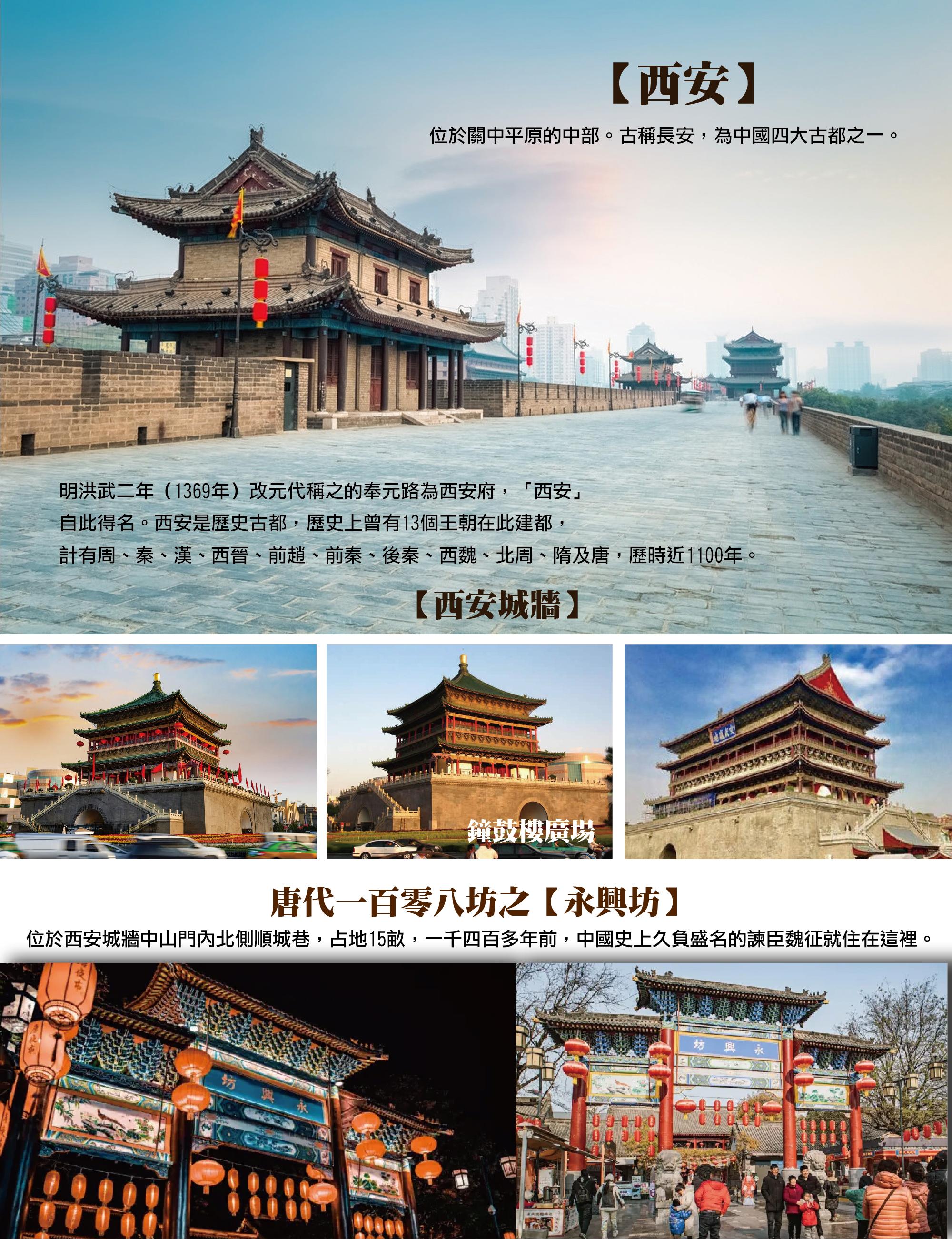 隨後前往中國歷史最悠久古都【西安】曾先後作為多個朝代的都城,包括周、秦、漢、隋、唐等,被譽為「十三朝古都」。西安不僅是中國古代政治與文化的重要中心,也是絲綢之路的起點城市,具有深厚的歷史底蘊與文化價值。城市內保存了大量歷史遺跡與文化景觀,如古城牆、鐘鼓樓、大雁塔等,展現出古代都城的格局與風貌。其中古城牆保存最為完整,環繞老城區一圈,成為現代城市與歷史遺產交融的象徵。西安同時也是中國重要的考古發掘地區,秦始皇陵及兵馬俑更是世界知名的文化遺產。除了歷史文化,西安也是現代化大城市,交通便利、經濟發展迅速,美食文化豐富,尤其以陝西麵食、小吃聞名。城市融合古今特色,既能感受千年歷史氛圍,也能體驗現代都市生活。整體而言,西安是一座兼具歷史厚度與現代活力的城市,是中國最具代表性的文化旅遊目的地之一。
