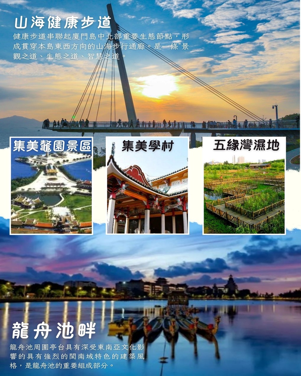 學府中的花園~花園中的學府美稱【集美學村】是廈門著名的文化與教育重鎮,由愛國華僑陳嘉庚先生於 1913 年創辦。整個學村依山傍海,融合中西建築風格,紅磚白牆的閩南建築群莊嚴典雅,園區內分布著集美中學、華僑大學、陳嘉庚紀念館等多個重要景點,充滿濃厚的人文氣息。漫步其中,既能感受書香氛圍,也能欣賞湖畔與古典建築交織的美景。每逢傍晚,夕陽映照在校舍屋頂的燕尾脊上,映出一幅溫柔的文化畫卷,是體驗廈門人文精神與教育傳承的最佳去處。