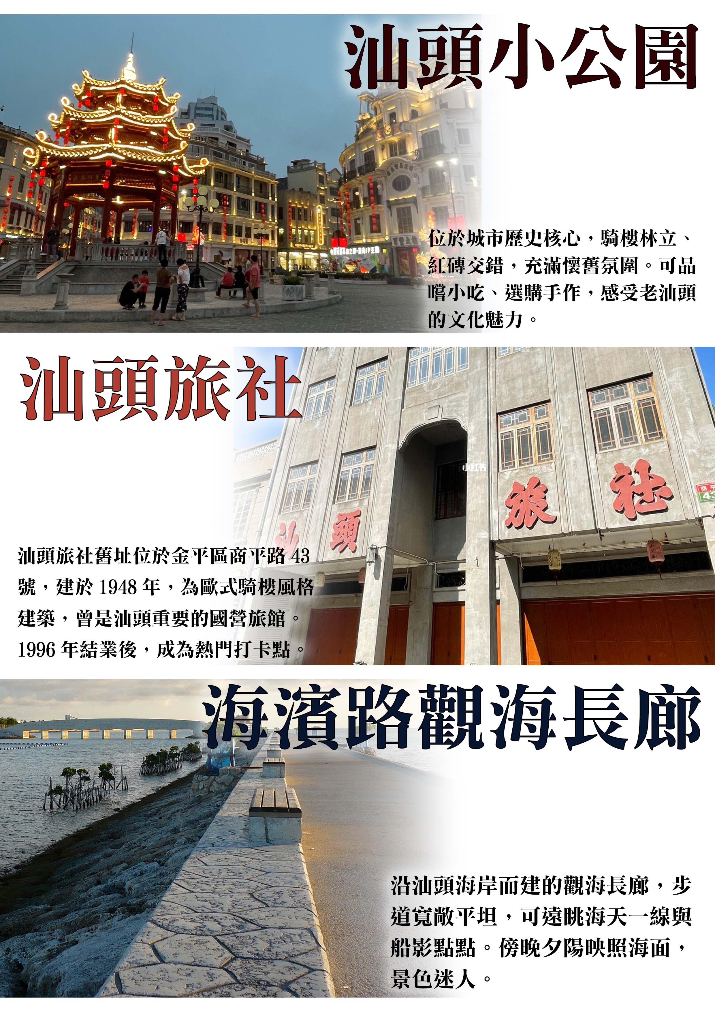 【汕頭市】位於中國廣東省東部沿海,是著名的港口城市和潮汕文化的重要發源地。這座城市融合了潮汕傳統文化、海洋經濟與現代城市風貌,擁有獨特的建築景觀與濃厚的人文氛圍。汕頭老城區保留了大量騎樓建築與歷史街道,漫步其中可感受到百年商港的繁華與潮汕民居的精緻工藝。市區著名景點包括小公園商業區、礐石風景區及汕頭博物館,其中礐石山可俯瞰市區全景,夕陽映照下的海灣格外迷人。
