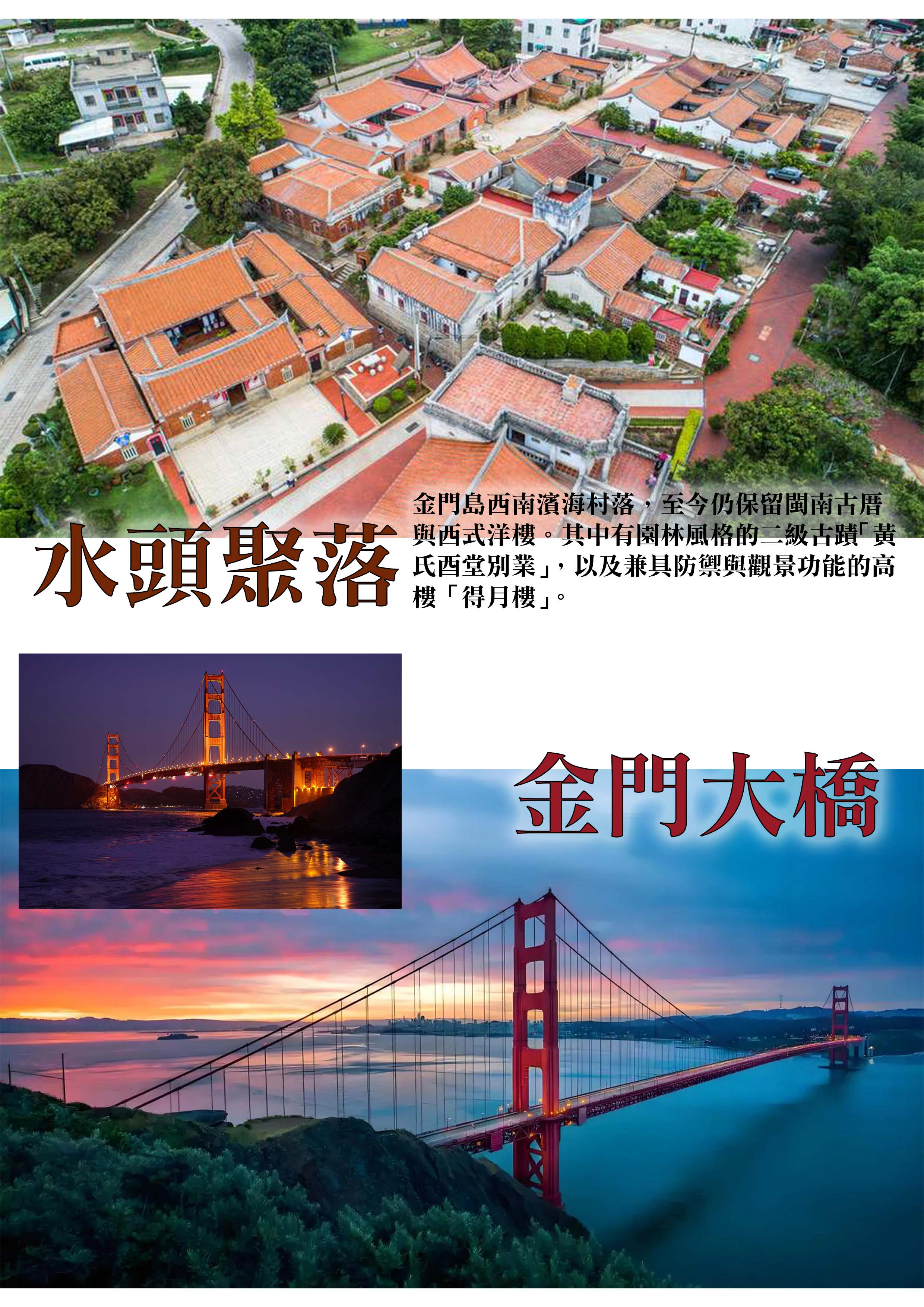 乘船前往金門【莒光樓】建於1952年,由金門防衛司令官胡璉所辟建,著名建築師沉學海所設計,仿古代麒麟閣三層式建築,外觀雄偉、氣宇非凡。莒光樓用以表彰駐紮金門軍人的英勇事蹟,宏揚毋忘在莒的精神,為金門戰地精神的象徵。後驅車前往機場返回台灣。