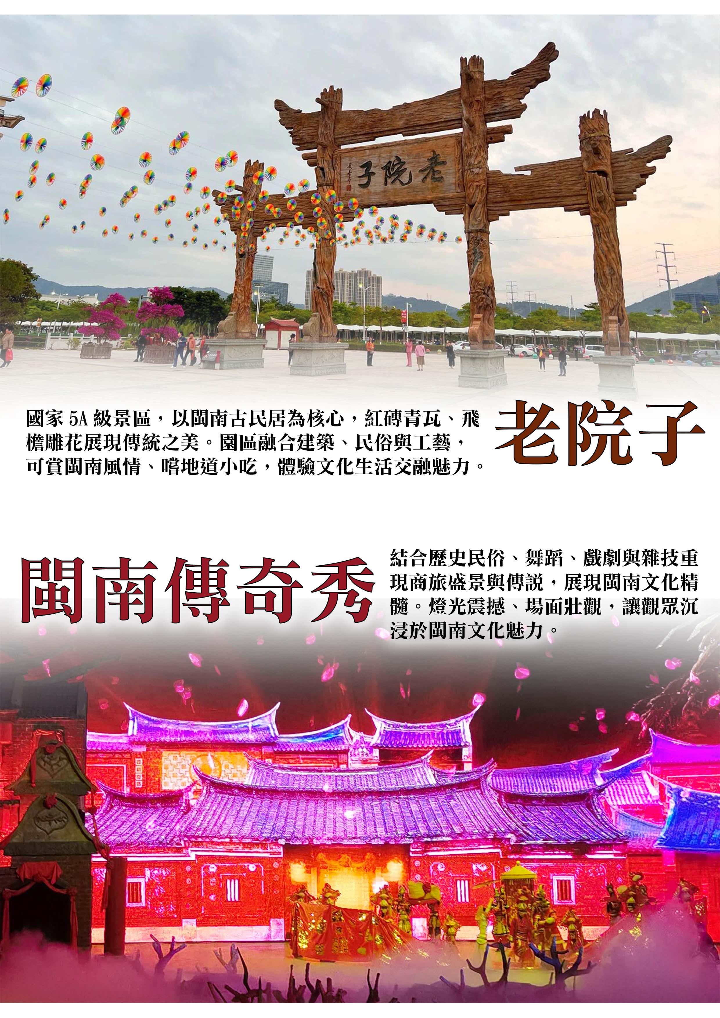 結合歷史民俗與舞台藝術的精彩表演【閩南傳奇秀】是一場專為呈現閩南獨特文化而打造。舞台上,演員們透過生動的表情、精準的肢體語言與傳統閩南音樂,將古代商旅往來的繁榮景象、海上貿易的興盛,以及流傳百年的民間傳說一一呈現。秀中巧妙融合舞蹈、戲劇、木偶與雜技等元素,不僅重現閩南歷史場景,還將神話故事、忠孝傳奇、地方英雄的傳說以充滿戲劇張力的方式呈現,使觀眾沉浸其中,彷彿穿越時光回到古老的閩南大街。舞台布景精緻多變,燈光與音效的配合更增強了視覺與聽覺的震撼力,每個細節都讓人感受到製作團隊的用心。除了精彩的演出,秀中還安排了互動橋段,讓觀眾能與表演者近距離交流,增加趣味性與參與感,無論大人或小孩都能融入故事情節之中。閩南傳奇秀不僅是一場娛樂表演,更是一堂生動的文化課,透過每一個精彩瞬間,讓觀眾感受到閩南歷史、民俗與藝術的深厚底蘊。觀賞結束後,觀眾不僅留下震撼的視聽印象,也能對閩南文化產生更深的理解與喜愛,成為旅程中難忘的亮點體驗。