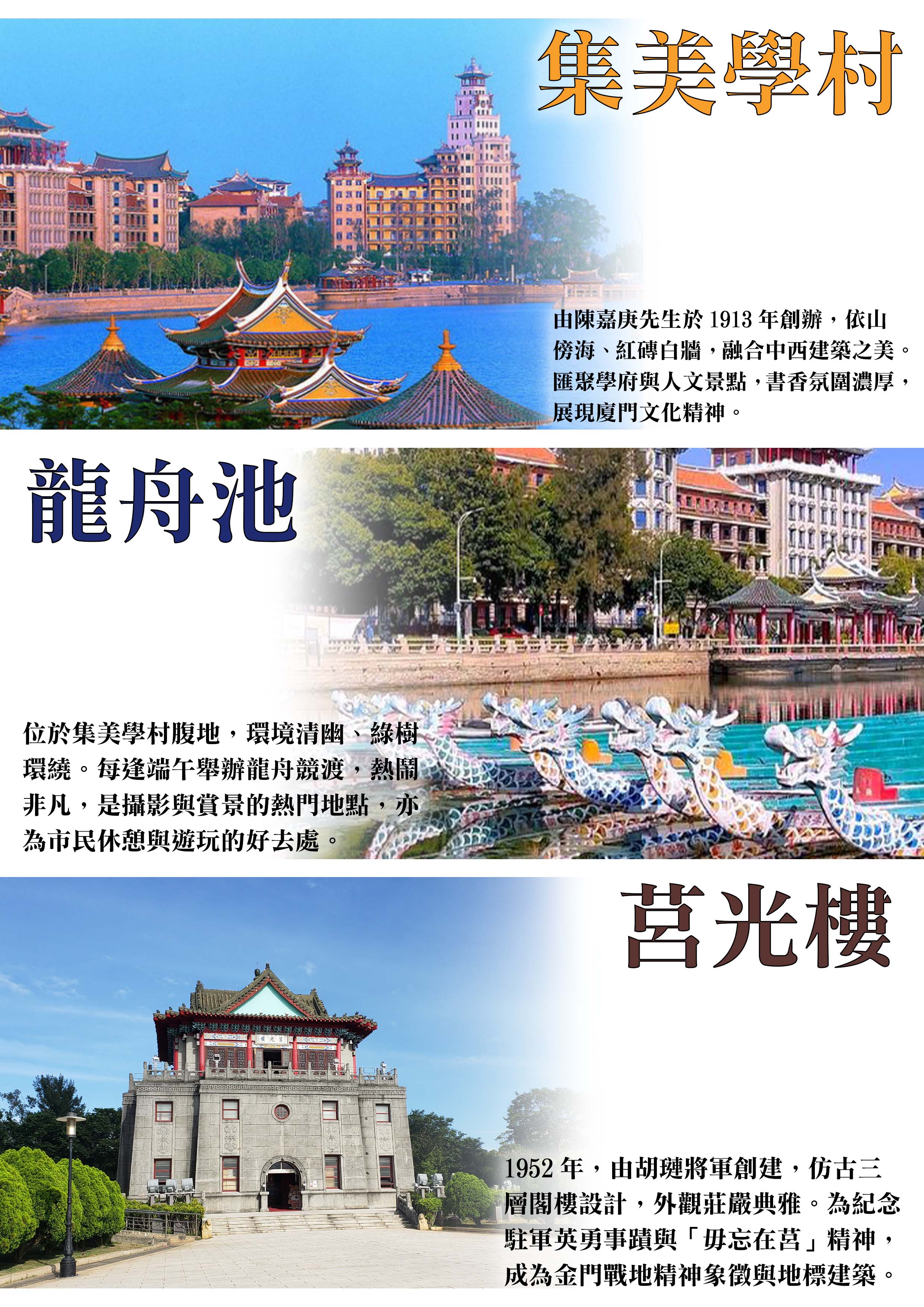 學府中的花園~花園中的學府美稱【集美學村】是廈門著名的文化與教育重鎮,由愛國華僑陳嘉庚先生於 1913 年創辦。整個學村依山傍海,融合中西建築風格,紅磚白牆的閩南建築群莊嚴典雅,園區內分布著集美中學、華僑大學、陳嘉庚紀念館等多個重要景點,充滿濃厚的人文氣息。漫步其中,既能感受書香氛圍,也能欣賞湖畔與古典建築交織的美景。每逢傍晚,夕陽映照在校舍屋頂的燕尾脊上,映出一幅溫柔的文化畫卷,是體驗廈門人文精神與教育傳承的最佳去處。