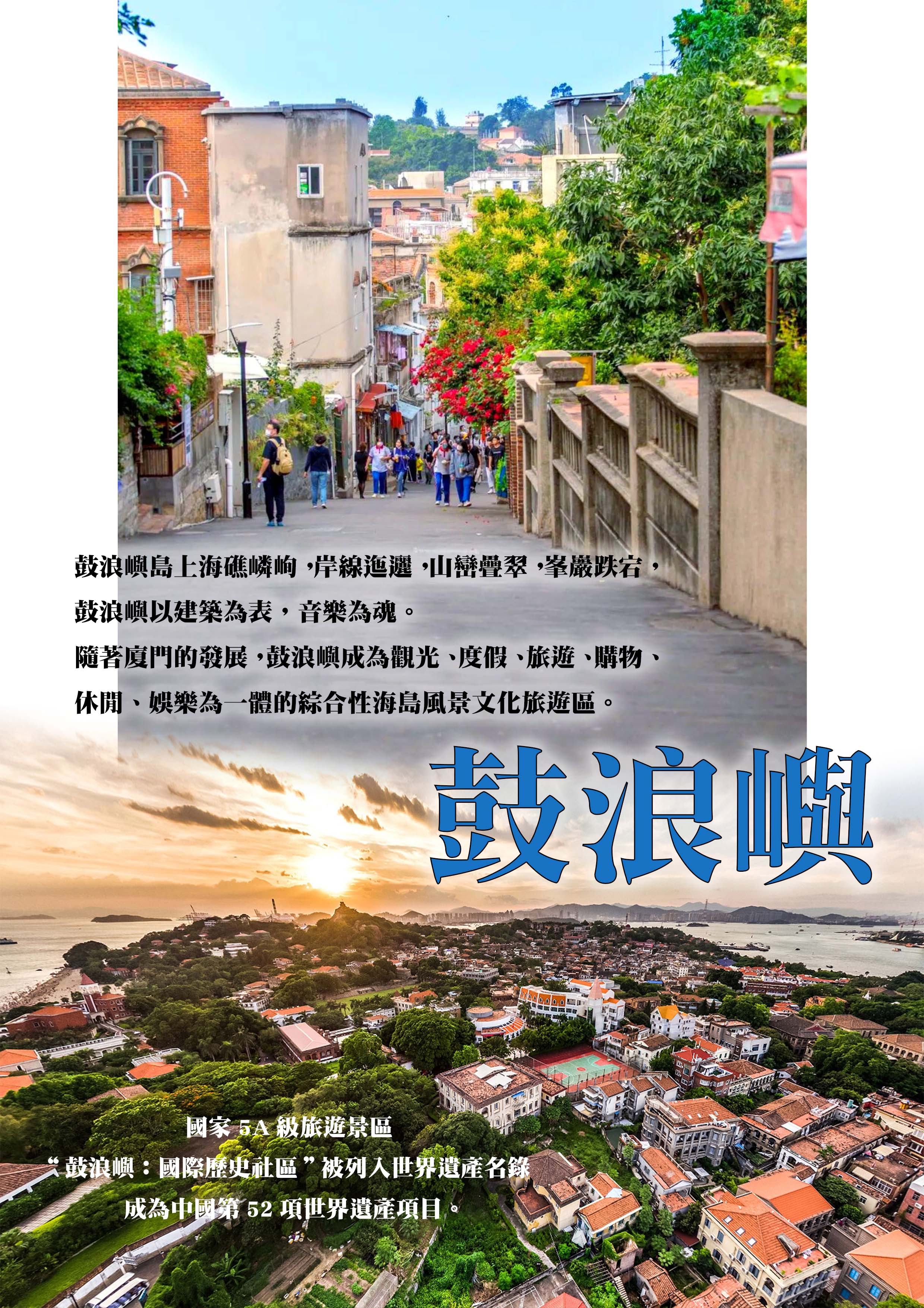 擁有鋼琴及小提琴的數量為全中國之首~世界文化遺產【鼓浪嶼】位於廈門島西南海域,是福建最具代表性的海島旅遊景點之一,以歷史文化與自然風光聞名。島上面積不大,但卻匯集了豐富的文化遺產與建築風格,尤其以「萬國建築博覽群」最具特色,展示了19世紀末至20世紀初的多國建築風格,包括巴洛克、哥特式、羅馬式及閩南傳統建築。漫步島上小巷,遊客可以欣賞紅磚灰瓦的別墅、尖塔屋頂與精緻雕花窗門,感受濃厚的歷史氛圍。鼓浪嶼也是音樂之島,島上多所歷史悠久的鋼琴館與音樂學校,使這裡成為音樂愛好者的朝聖地。除了文化建築,鼓浪嶼的自然景觀同樣迷人,海岸線蜿蜒曲折,海水清澈見底,沿岸的沙灘、岩石與綠樹營造出休閒散步的理想環境。