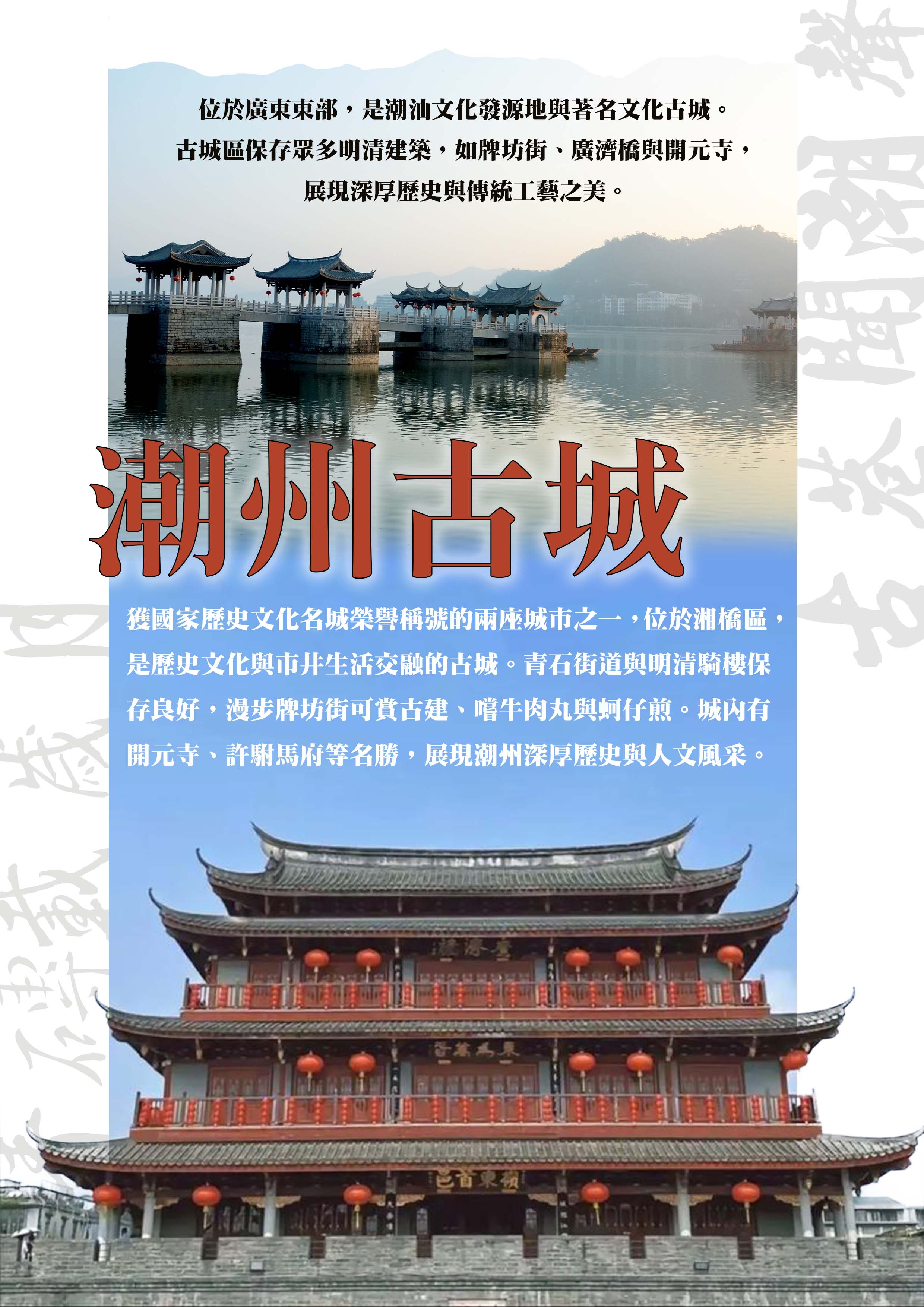 【潮州市】位於中國廣東省東部,是潮汕文化的重要發源地,也被譽為“文化古城”。這座城市融合了深厚的歷史底蘊、精美的古建築與獨特的民俗文化。潮州古城區保留了大量明清時期的建築,如牌坊街、廣濟橋、開元寺等,每一處都展現了潮汕傳統建築的細膩工藝與文化韻味。