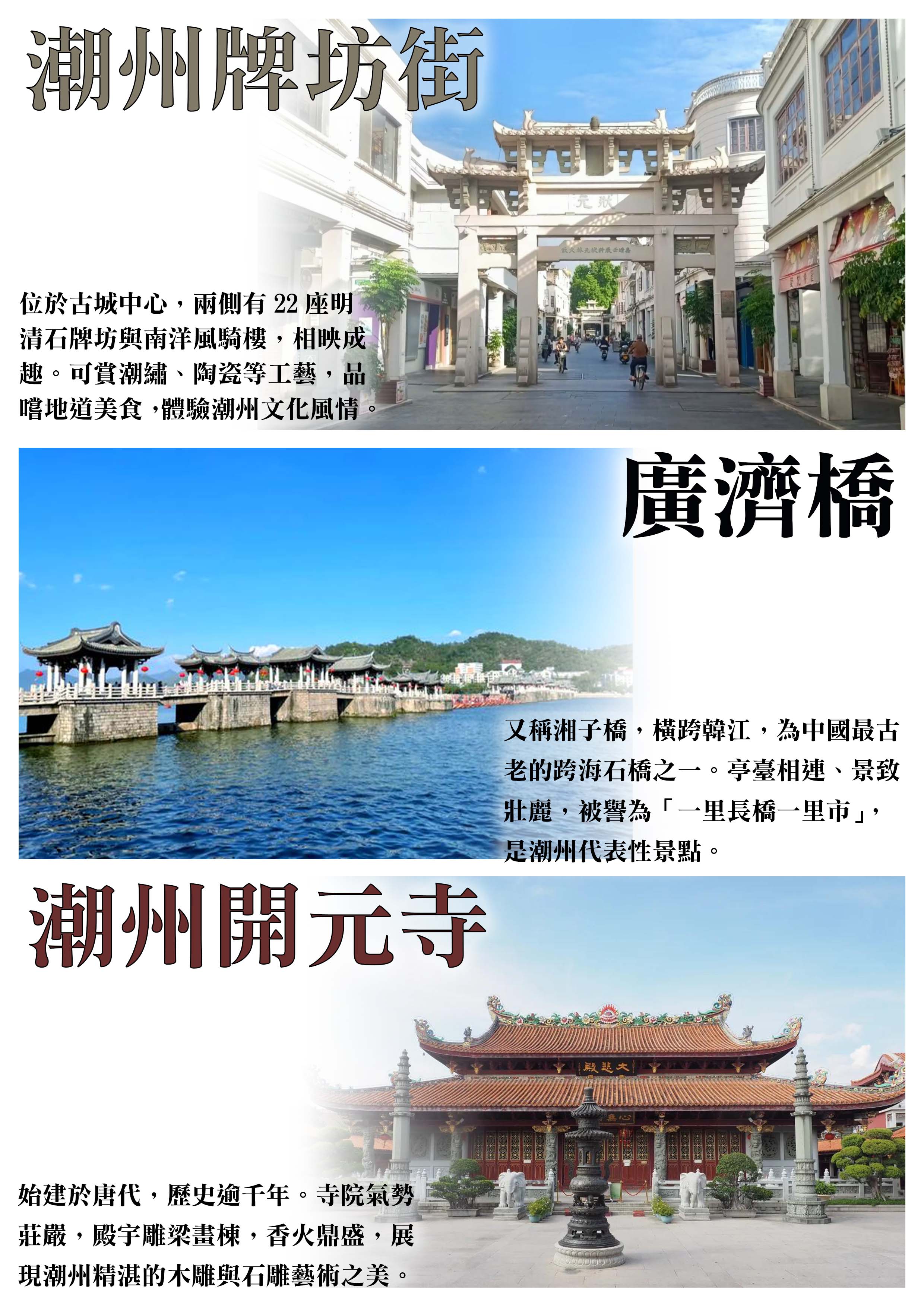 獲得國家歷史文化名城榮譽稱號的兩座城市之一【潮州古城】潮州古城主要位於潮州市湘橋區,是一片歷史文化與市井生活完美交融的區域。走進古城,青石板鋪就的街道、明清古建築與騎樓整齊排列,讓人彷彿穿越時光,感受古城昔日的繁華景象。遊客可以沿著牌坊街漫步,欣賞雕刻精美的牌坊建築,品味地道潮州美食,如牛肉丸、蚵仔煎和甜品豆花,每一步都散發濃厚的地方風味。除了街區漫遊,古城內還有多處知名歷史景點,如宏偉莊重的開元寺、保存完好的許駙馬府,以及富有文化底蘊的已略黃公祠,每一座建築都展示著潮州的歷史積澱與文化風采。沿街小店、茶館與手工藝作坊點綴其間,讓遊客在欣賞古建築之餘,也能感受傳統工藝與民俗文化的細膩魅力。