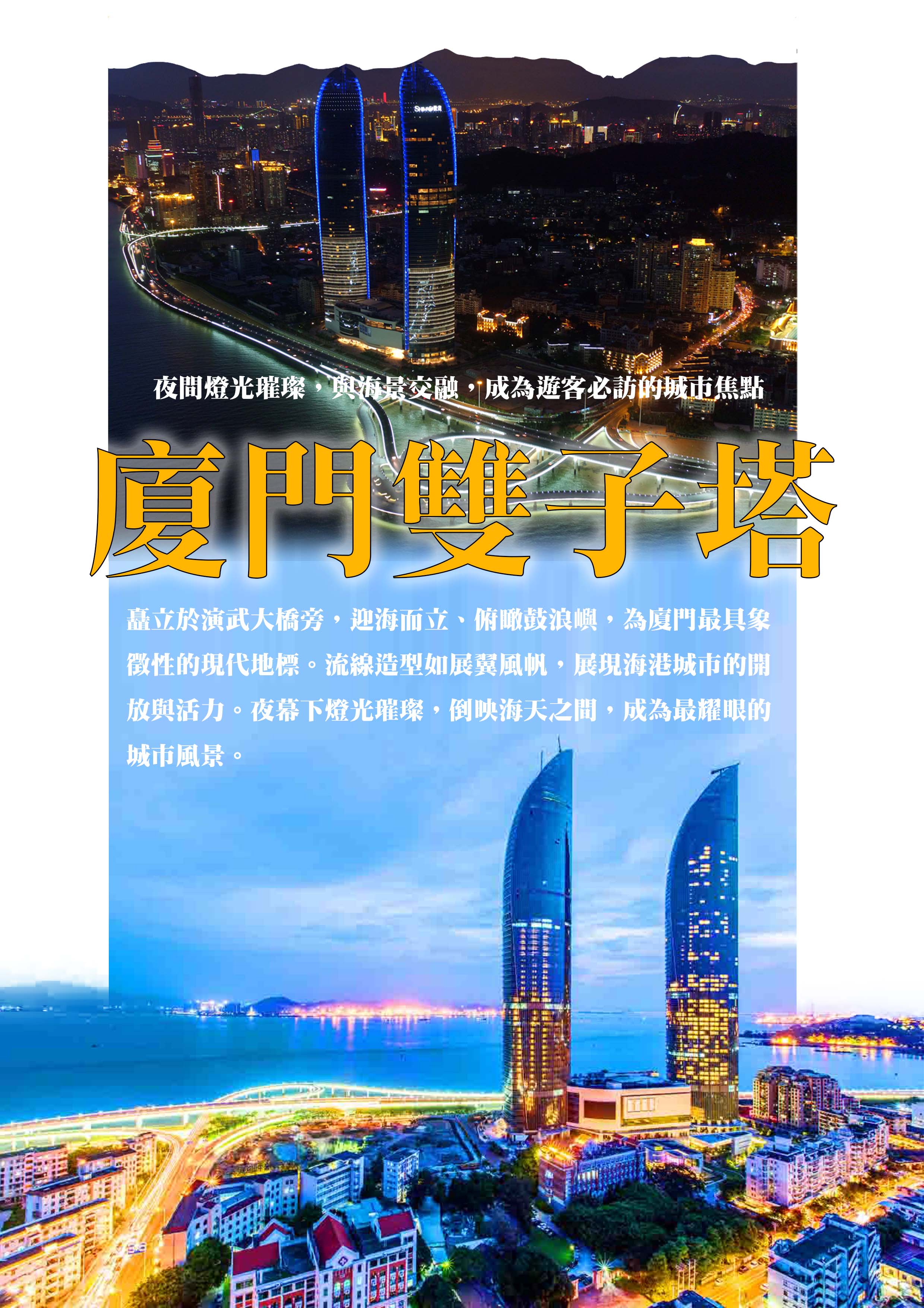 外觀~廈門標誌性城市景觀之一【雙子塔】矗立於思明區演武大橋旁,面朝碧海藍天,背倚鼓浪嶼與城市天際線,成為廈門最具代表性的現代建築之一。這對高聳入雲的雙塔由兩棟相連的摩天大樓組成,高度超過三百公尺,外觀採流線型設計,如同兩片迎風展翼的帆,象徵廈門這座海港城市的開放與活力。夜幕降臨時,塔身燈光閃耀,與海面倒影交相輝映,構成壯麗的城市夜景,吸引無數遊客駐足拍照。雙子塔內設有高級商場、辦公大樓、觀景平台與星級酒店,集商務、旅遊與休閒於一體,不僅是廈門的經濟地標,更是城市文化與現代建築藝術的完美結合,象徵著廈門邁向國際化都市的自信與風采。
