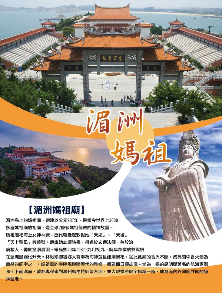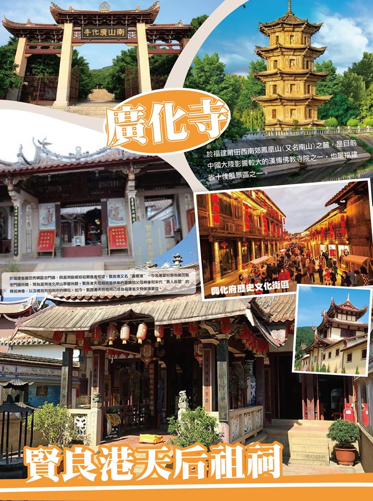 帶著愉快的心情於臺灣五大機場集合,由專人辦理登機手續後,隨即搭乘豪華客機前往金門。後乘豪華船前往海上花園—廈門,隨後驅車前往【莆田】位於中國福建省東南沿海,是閩東南的重要城市,也被譽為「媽祖故鄉」。莆田歷史悠久,文化底蘊深厚,擁有眾多古跡和傳統民俗。市區以閩江支流為主,水系縱橫,使這裡成為歷史上重要的商貿和漁業中心。莆田以媽祖文化聞名,每年舉辦的媽祖文化節吸引大量海內外遊客,展現濃厚的民間信仰和傳統文化氛圍。自然景觀方面,莆田擁有東山島、湄洲島等海濱勝地,海岸線曲折優美,沙灘潔白細膩,是休閒度假的理想選擇。此外,莆田的工藝品、木雕和鞋業製造也頗具盛名,形成獨特的地方產業特色。整體而言,莆田兼具文化底蘊、自然景觀與經濟活力,是一個歷史與現代交融、值得深入探索的城市。