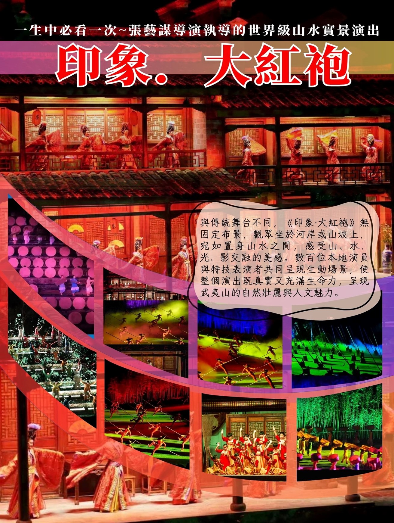 一生中必看一次~張藝謀導演執導的世界級山水實景演出【印象.大紅袍】依托武夷山壯麗的自然景觀作為舞台,九曲溪蜿蜒流淌、天遊峰巍峨挺立,山水與表演融為一體。整場演出以武夷岩茶大紅袍為靈感,透過舞蹈、音樂與戲劇化場景,展現茶農生活、茶葉傳奇及茶文化的悠久歷史。演員們在溪水、石壁與梯田間穿梭,水上船舞、山谷歌聲與光影效果交織,每一個動作都與自然景致呼應,營造出奇幻而震撼的視覺體驗。與傳統舞台不同,《印象·大紅袍》無固定布景,觀眾坐於河岸或山坡上,宛如置身山水之間,感受山、水、光、影交融的美感。數百位本地演員與特技表演者共同呈現生動場景,使整個演出既真實又充滿生命力,呈現武夷山的自然壯麗與人文魅力。這場演出不僅是一場視覺盛宴,也是一段文化體驗,讓每位觀眾深刻感受到武夷山山水的絕美與茶文化的底蘊,是來到武夷山不可錯過的經典之旅。武夷山,不僅是一處風景,更是一首流動於山水之間的詩。