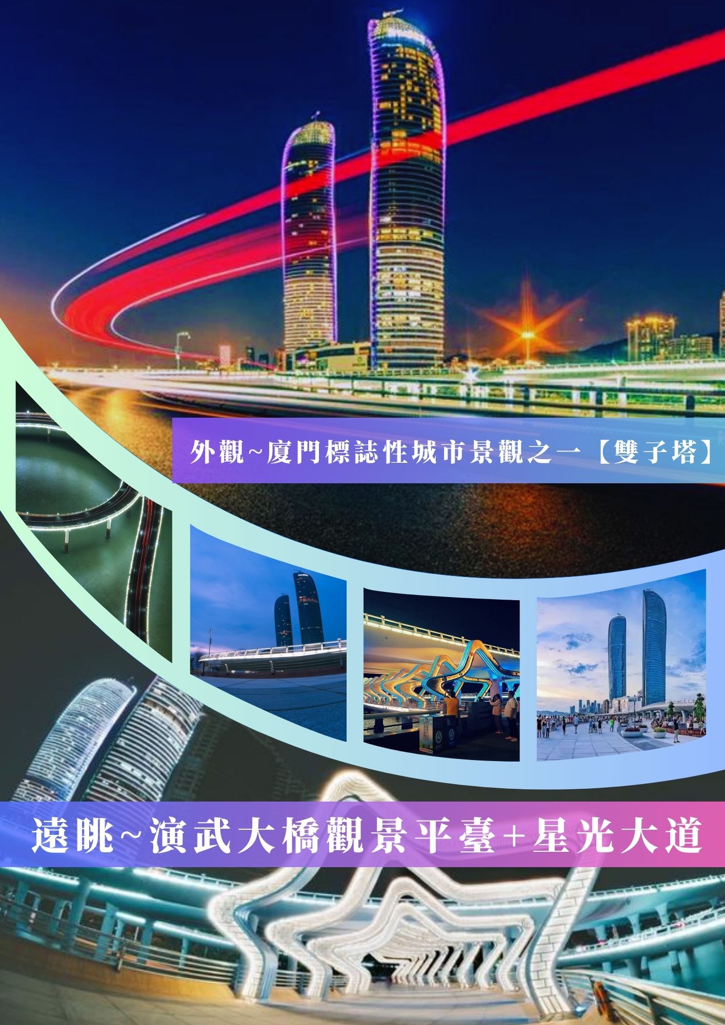 外觀~廈門標誌性城市景觀之一【雙子塔】矗立於思明區演武大橋旁,面朝碧海藍天,背倚鼓浪嶼與城市天際線,成為廈門最具代表性的現代建築之一。這對高聳入雲的雙塔由兩棟相連的摩天大樓組成,高度超過三百公尺,外觀採流線型設計,如同兩片迎風展翼的帆,象徵廈門這座海港城市的開放與活力。夜幕降臨時,塔身燈光閃耀,與海面倒影交相輝映,構成壯麗的城市夜景,吸引無數遊客駐足拍照。雙子塔內設有高級商場、辦公大樓、觀景平台與星級酒店,集商務、旅遊與休閒於一體,不僅是廈門的經濟地標,更是城市文化與現代建築藝術的完美結合,象徵著廈門邁向國際化都市的自信與風采。