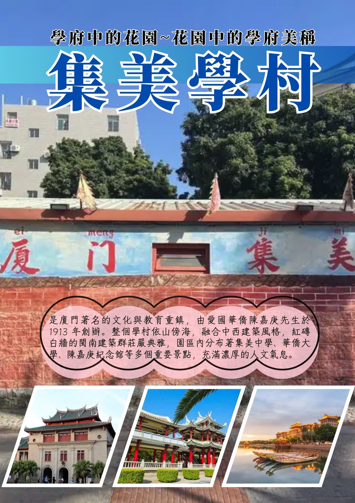 學府中的花園~花園中的學府美稱【集美學村】是廈門著名的文化與教育重鎮,由愛國華僑陳嘉庚先生於 1913 年創辦。整個學村依山傍海,融合中西建築風格,紅磚白牆的閩南建築群莊嚴典雅,園區內分布著集美中學、華僑大學、陳嘉庚紀念館等多個重要景點,充滿濃厚的人文氣息。漫步其中,既能感受書香氛圍,也能欣賞湖畔與古典建築交織的美景。每逢傍晚,夕陽映照在校舍屋頂的燕尾脊上,映出一幅溫柔的文化畫卷,是體驗廈門人文精神與教育傳承的最佳去處。