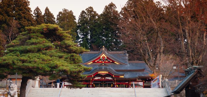 盛岡八幡宮曾經遭遇一次大火,於西元1890年重建,西元1997年興建新大社殿。大殿以紅色為主調,配以棕黑色的屋頂、金箔裝飾及彩漆圖案,和平時所見的一般神社不同,少了一份暗沉的感覺,多了一份高貴的氣勢。