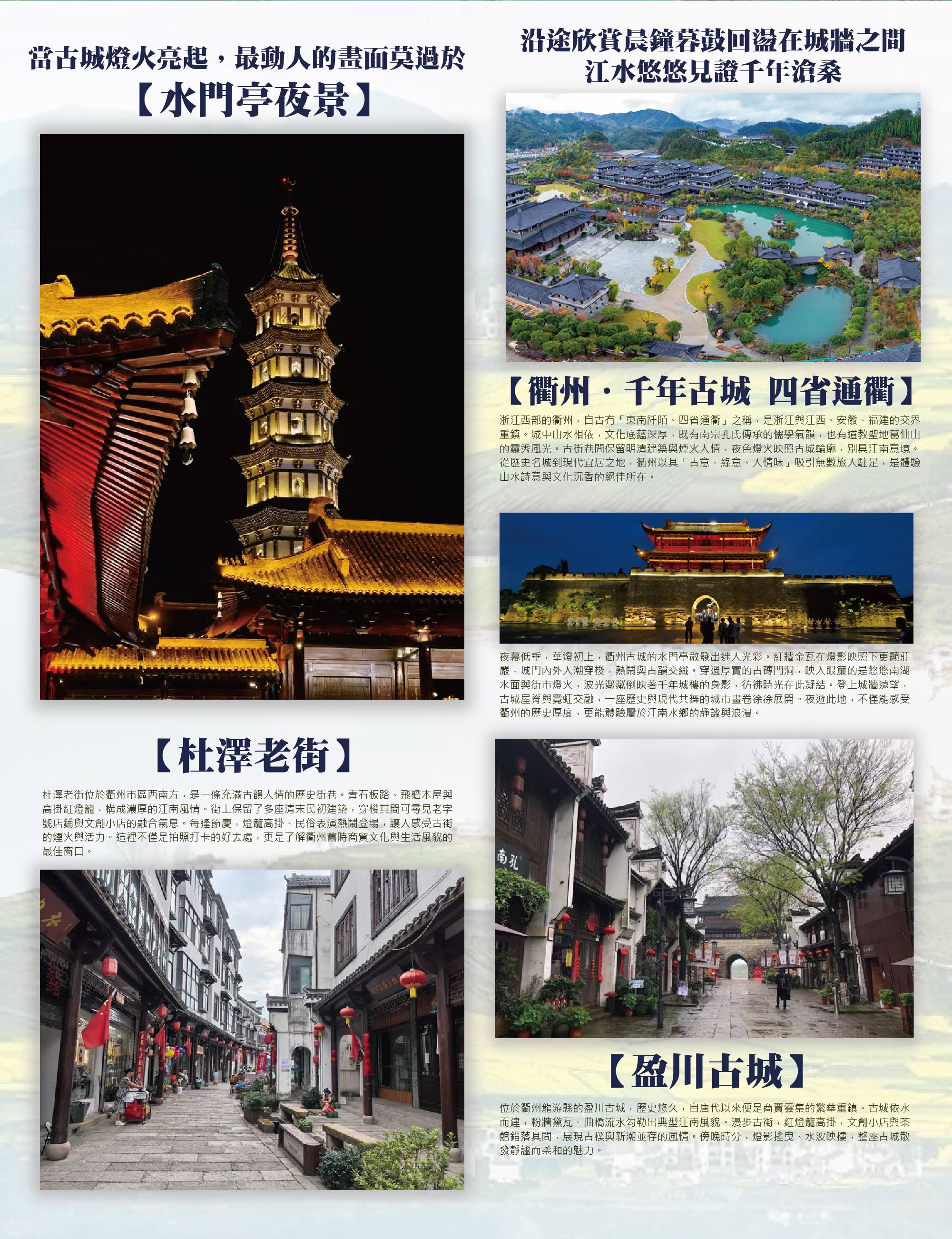 衢州.千年古城 四省通衢】浙江西部的衢州,自古有「東南阡陌、四省通衢」之稱,是浙江與江西、安徽、福建的交界重鎮。城中山水相依,文化底蘊深厚,既有南宗孔氏傳承的儒學氣韻,也有道教聖地葛仙山的靈秀風光。古街巷間保留明清建築與煙火人情,夜色燈火映照古城輪廓,別具江南意境。從歷史名城到現代宜居之地,衢州以其「古意、綠意、人情味」吸引無數旅人駐足,是體驗山水詩意與文化沉香的絕佳所在。