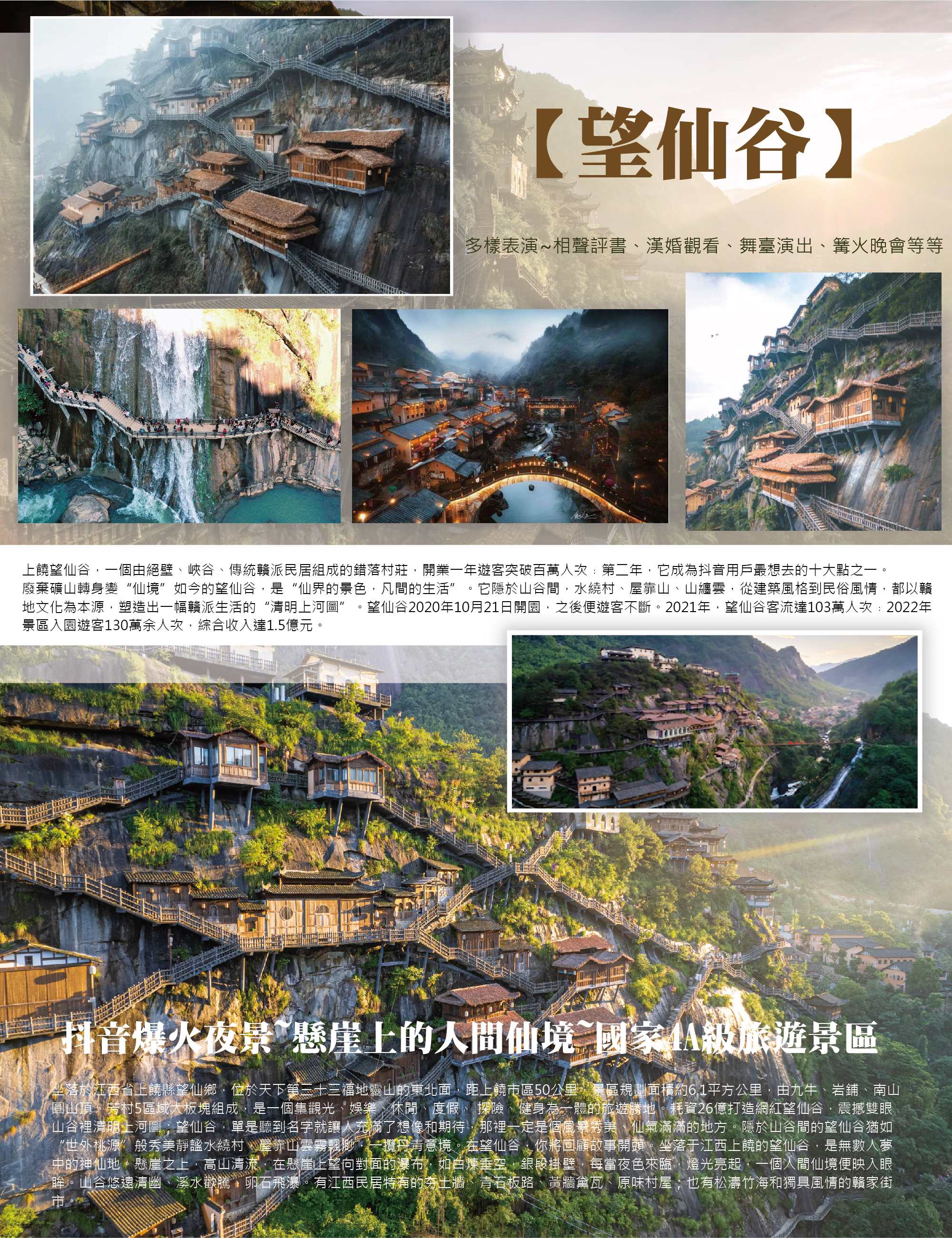 【望仙谷】景區位於江西上饒山區,以峽谷地形、懸崖聚落與山水景觀聞名。景區依山谷自然地貌規劃,保留岩壁、溪流與林木層次,並融入木石建築與步道系統,形成獨特的山谷景觀聚落。白天行走於谷地之間,可近距離感受溪水流動與岩壁起伏;入夜後,燈光沿著懸崖、橋樑與山谷層層點亮,勾勒出立體的山城夜色,使整個景區呈現截然不同的視覺感受。夜間景觀為望仙谷最具代表性的看點之一。景區動線完整,主要景點集中,適合安排下午入園、夜間欣賞燈景,兼顧自然景觀與拍照需求,是近年江西相當具話題性的山水夜景景區。