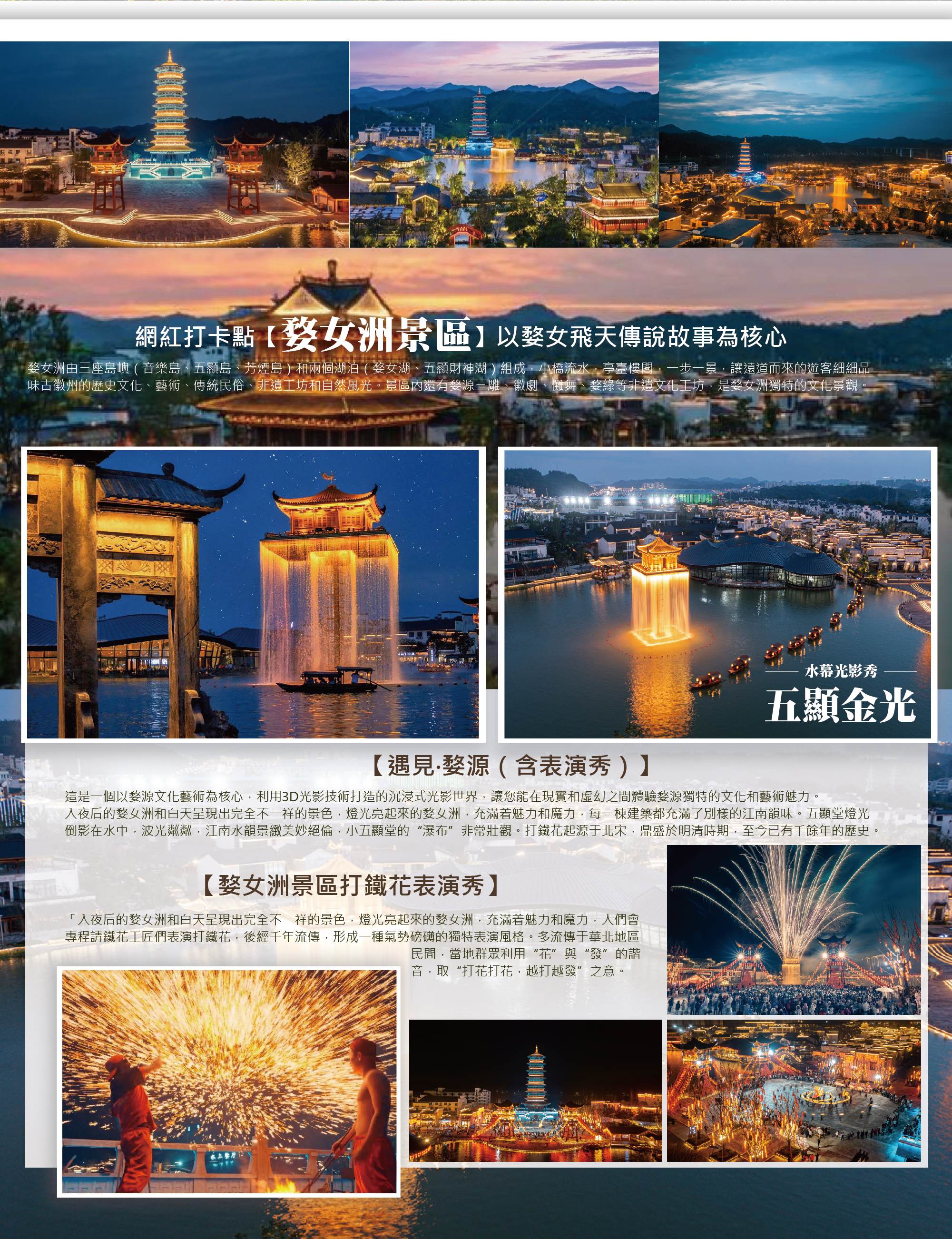 煙波浩渺、燈火璀璨,一座融合傳統與創新的文化小鎮靜靜綻放,綜合性文化旅遊度假區【婺女洲景區-文昌書肆-金康館-非遺打鐵花秀…等等】以婺女飛天傳說為主題,以新式徽派建築風格為基調,匯集文昌書肆、金康館、非遺打鐵花秀等多元文化體驗。整體設計融合徽州古韻與現代光影藝術,展現出“詩意江南、夢回徽州”的獨特美感。白日可漫步文昌書肆感受書香氣息,品味徽州人文底蘊;入夜後則有五顯金光塔與抱玉塔交相輝映,水幕流光與火樹銀花同放異彩,非遺打鐵花更讓夜空綻放出耀眼星雨。這裡不僅是一座文化與藝術交融的休閒聖地,更是能體驗古風雅韻、感受江南盛景的夢幻之境。