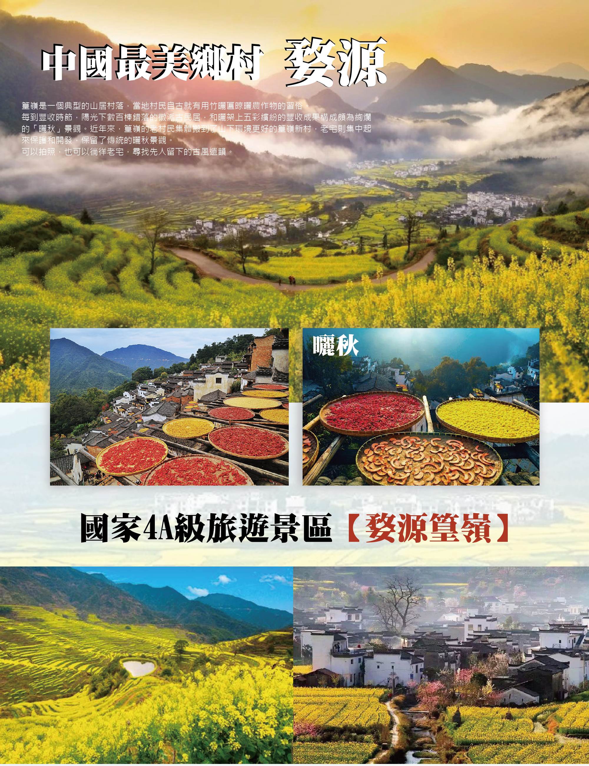 江南小布達拉宮美稱~中國最美符號【婺源篁嶺景區(含纜車+電瓶車,遊覽約2小時)】篁嶺位於江西省上饒市婺源縣東北部,是典型山居村落,以懸崖人家、曬秋美景聞名中外。整個村落依山而建,層層屋舍錯落分布,白牆黛瓦在山巒綠意間交織出壯麗畫卷。遊客可搭乘纜車登山俯瞰村景,遠眺雲霧飄渺的梯田與古村全貌;亦可乘電瓶車穿梭於山腳與入口之間,輕鬆體驗徽州山村的靜謐氛圍。每至秋季,家家戶戶屋前屋後曬滿椒紅、菊黃、柿橙等農作,繪出婺源最經典的「曬秋圖景」。這裡不僅是攝影愛好者的天堂,更是感受人文、自然與生活共融的世外桃源。