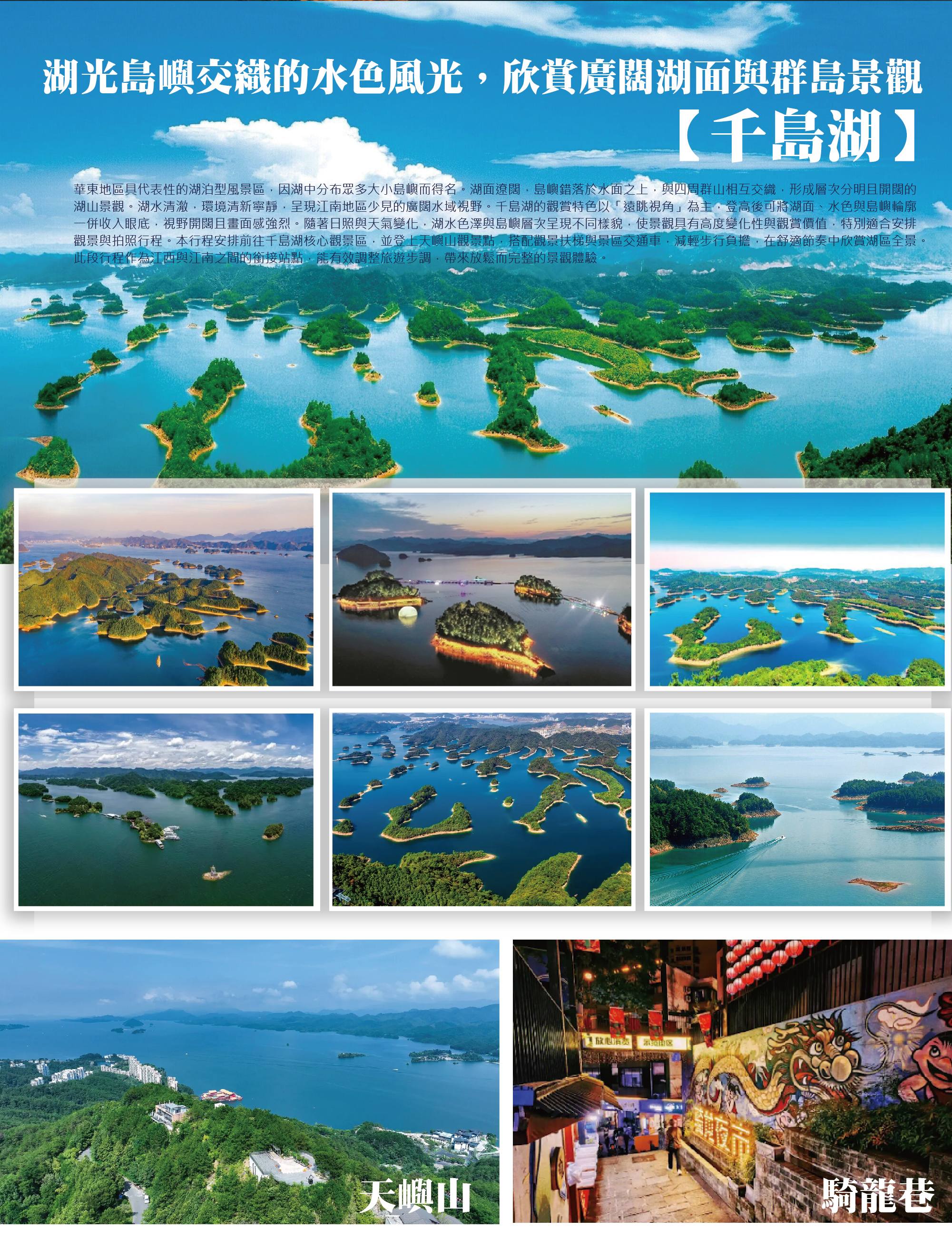 第四天【婺源-千島湖】湖光島嶼交織的水色風光,欣賞廣闊湖面與群島景觀【千島湖】→漫步湖城發展留下的傳統街巷,感受市區老街氛圍【騎龍巷】→千島湖觀景絕佳處,俯瞰湖面與群島交錯景致【天嶼山(含觀景扶梯+景交車)】