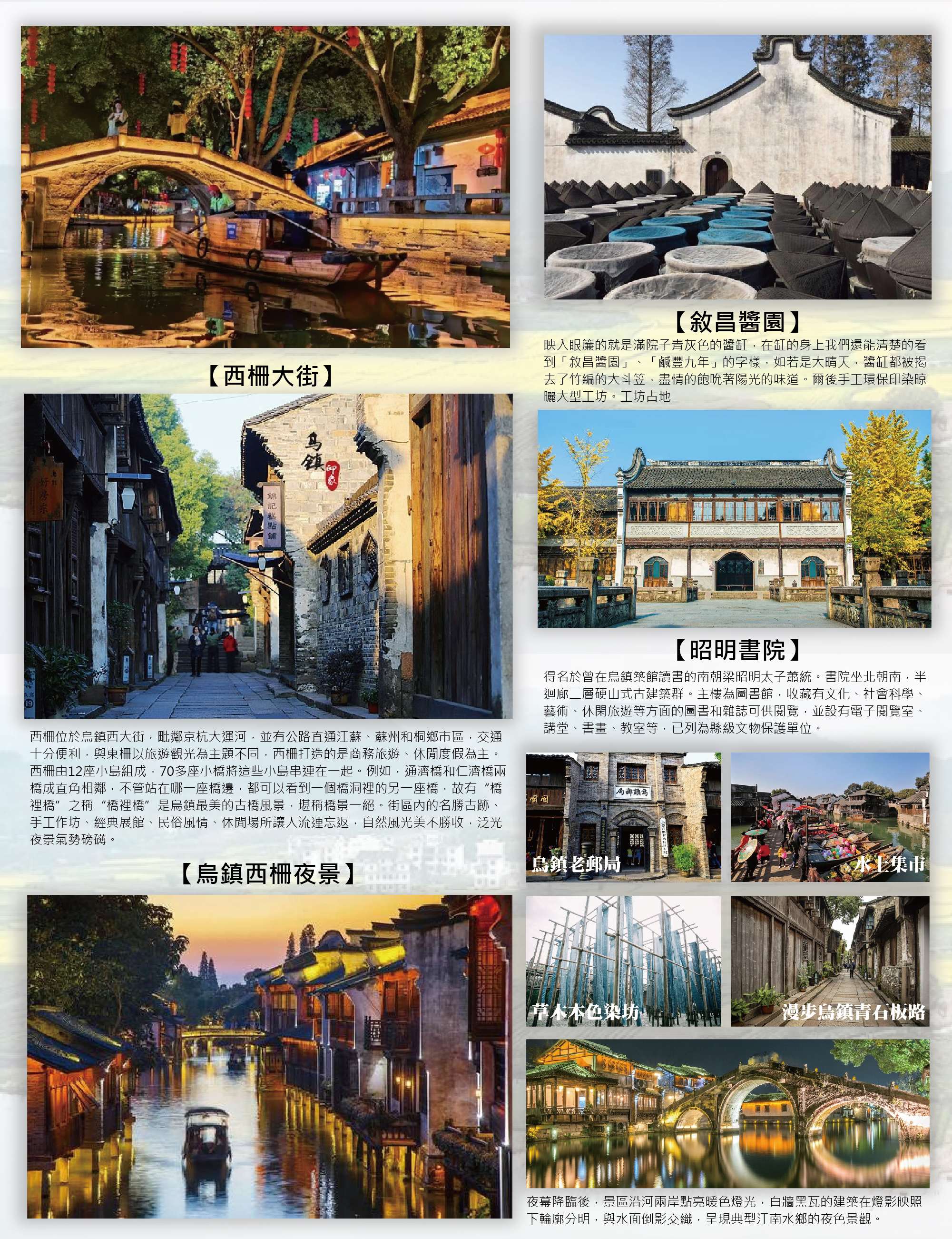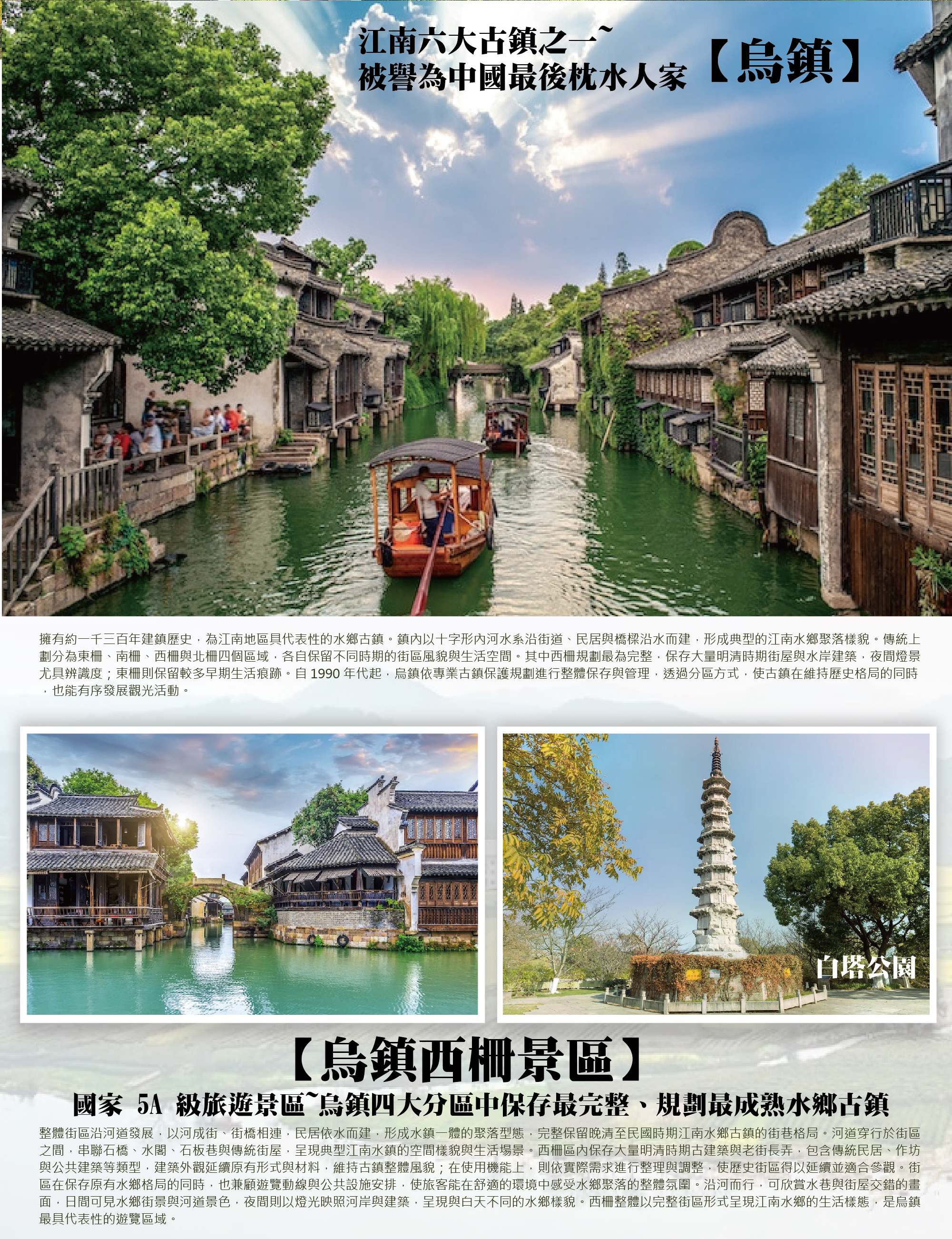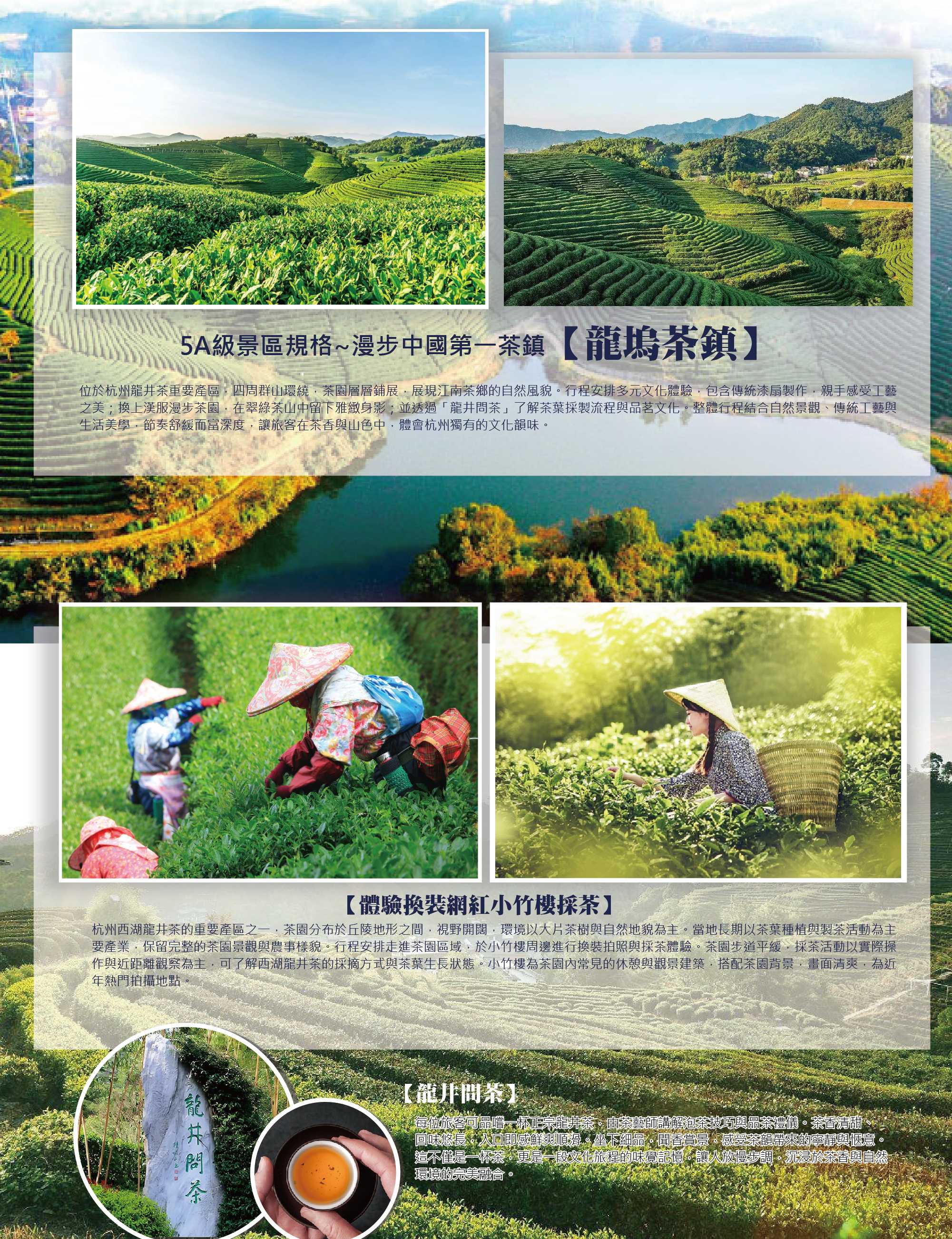第五天【千島湖-杭州-烏鎮】杭州【龍塢茶鎮(體驗換裝網紅小竹樓採茶)】→傳承千年的水鄉聚落【烏鎮】→古塔與鐵道交會的江畔公園【白塔公園】→國家5A級旅遊景區,以河成街的江南古鎮【烏鎮西柵景區】